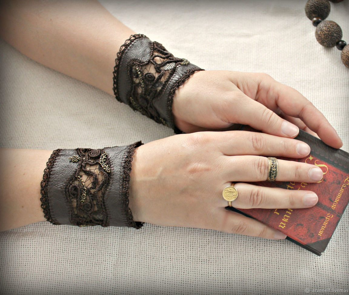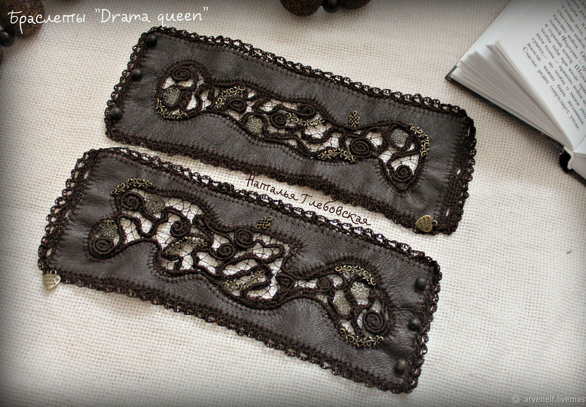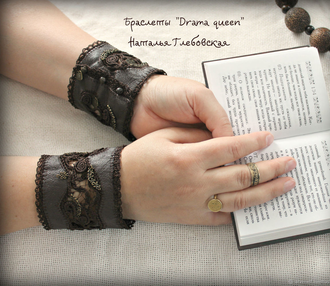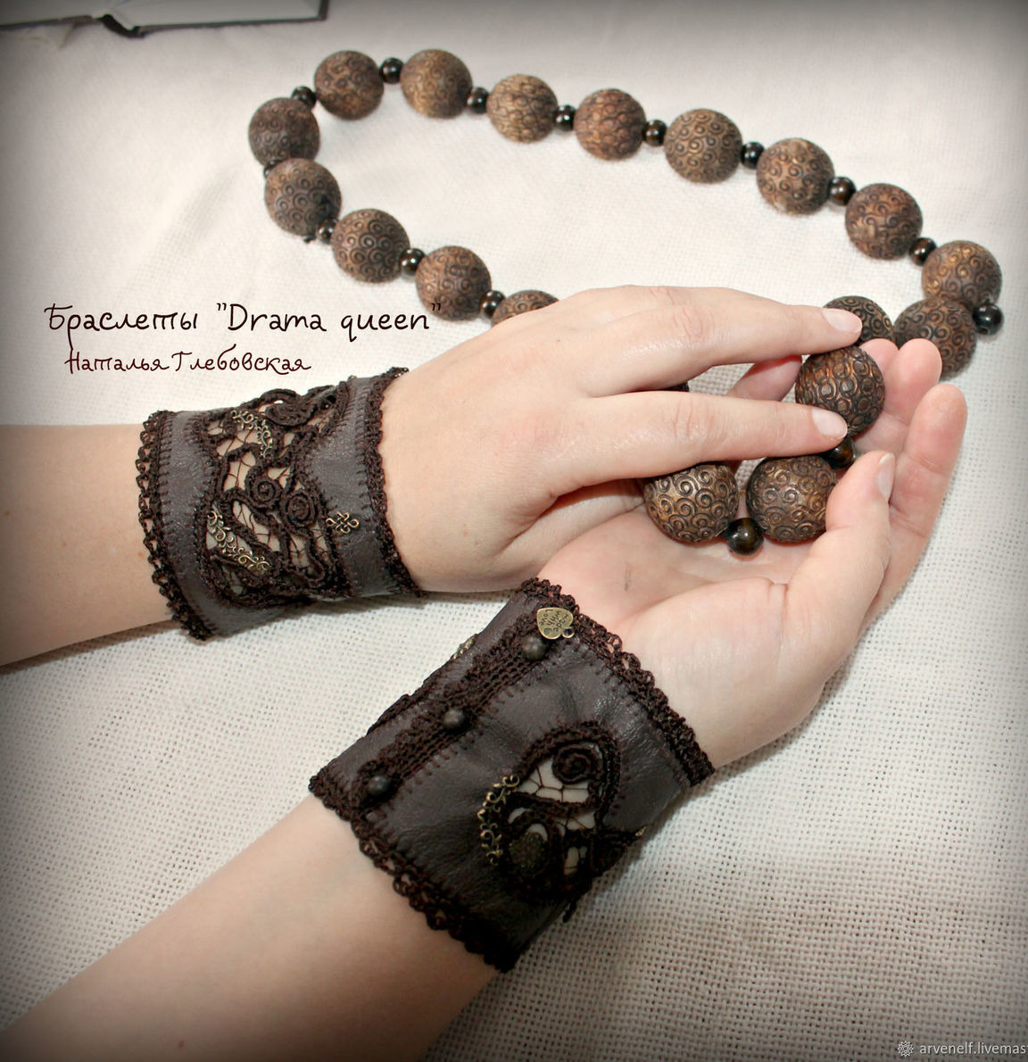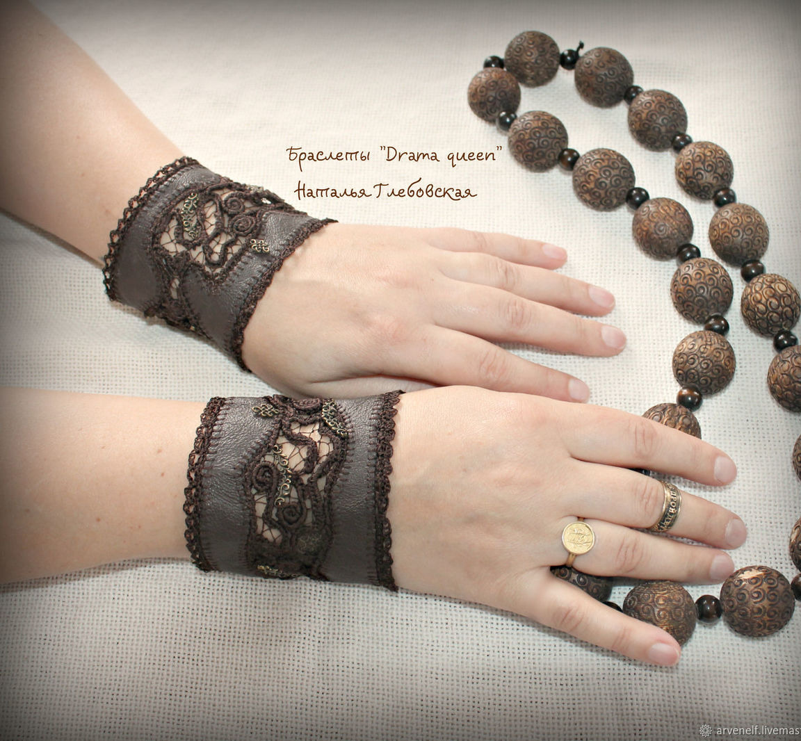 Стильные, необычные браслеты- манжеты"Drama queen" созданы на заказ. Основа браслетов- мягкая кожа роскошного оттенка горького шоколада.. Элементы связаны крючком тончайшей нитью шелка и скреплены по принципу "ирландского" или сцепного кружева, . Декор- фурнитура под бронзу, . Застегиваются на 3 деревянных сандаловых бусины.Регулируя, на сколько бусин застегнуть, можно выбрать и каким образом носить- до половины кисти, или только на запястье. Очень необычный , индивидуальный аксессуар.Повторить один в один такие браслеты не возможно.