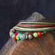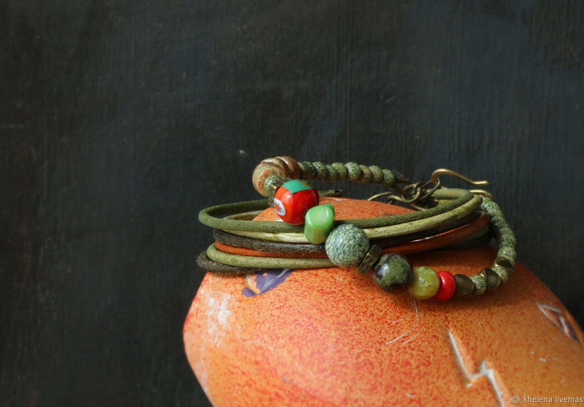 Тонкий браслет бохо из камней в зеленых оттенках (унакит, змеевик, риолит) с красным акцентом из бусины миллефиори. Дополнен браслетом из кожаных шнуров.