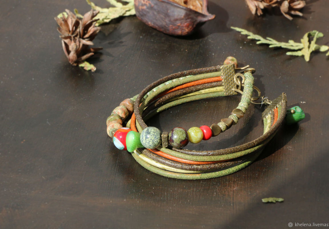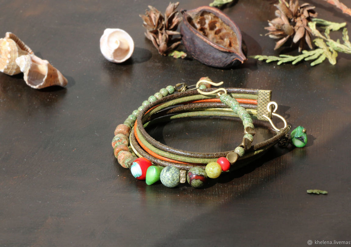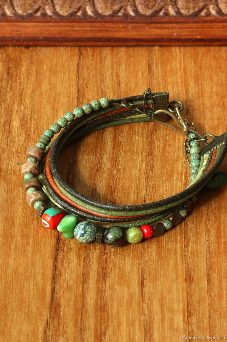 браслет из кожи, браслет из бусин, зелено коричневый, браслеты в этническом стиле, Алый акцент, браслеты бохо купить, украшения в отпуск, браслет с унакитом, сет браслетов в стиле бохо, набор этнических браслетов, сет зеленых браслетов, летняя бижутерия