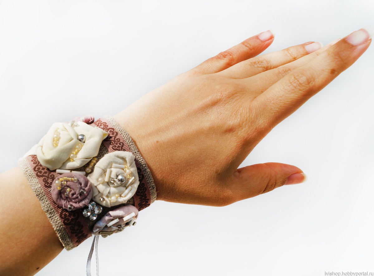 Браслет завязывается по типу корсета. Основную ленту продевают крест на крест в имеющиеся петли, затем браслет одевают на руку и ленту стягивают. Удобство такого способа состоит в том, что ширину браслета можно регулировать самостоятельно. Плотное прилегание без зазоров получится при объеме запястья 14-15 см.