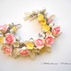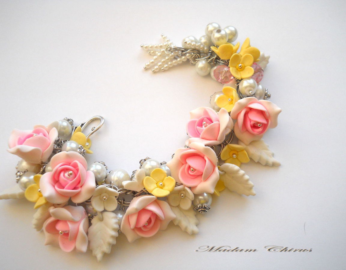 подарок на 8 марта, подарок, свадебное украшение, браслет ручной работы, комбинированный, весеннее украшение, весенние цветы, цветочное украшение, розовый браслет, браслет с розами, браслет с жемчугом, свадебный браслет, браслет из полимерной, браслет с желтыми цветами