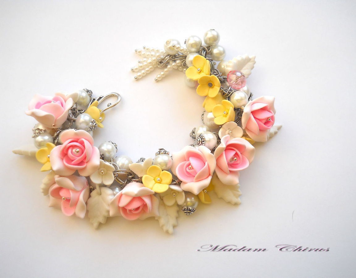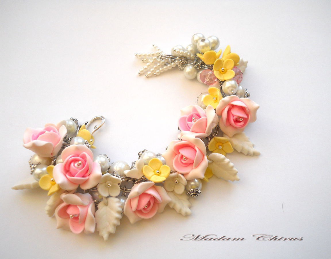 Нарядное изящное украшение из бельгийского полимерного пластика, очень нежные розы с тройным переходом цвета , мелкие светло желтые и белые цветы. Много жемчуга Майорки и крупного речного жемчуга. Авторская ручная работа. При заказе украшения укажите размер запястья