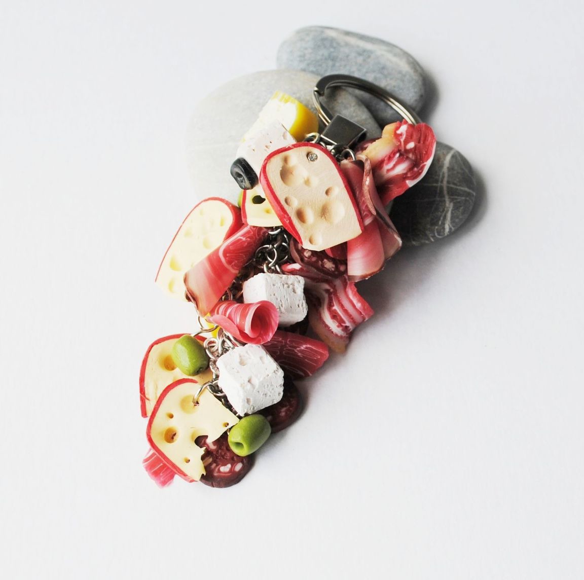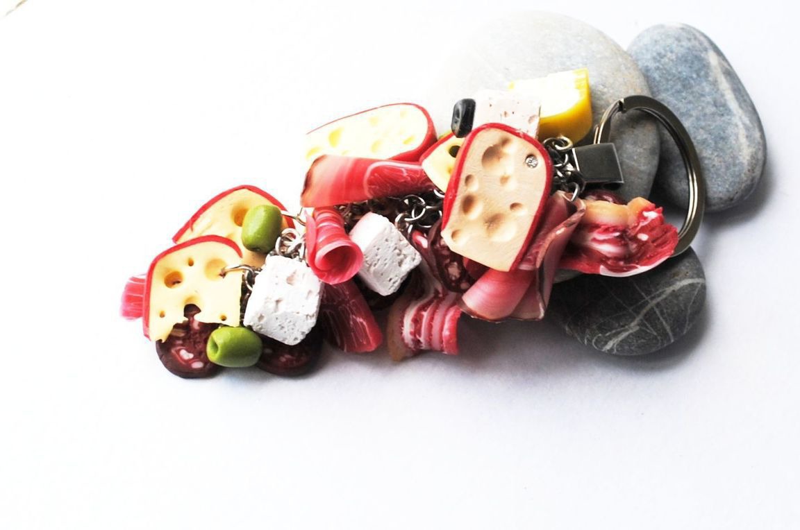 Идея родилась случайно, но прижилась . Вылепленные вручную 4 вида сыра, оливки, маслины и четыре вида мясных деликатесов, собранные в брелок стали чудесным сувениром и подарком, особенно их любят мужчины