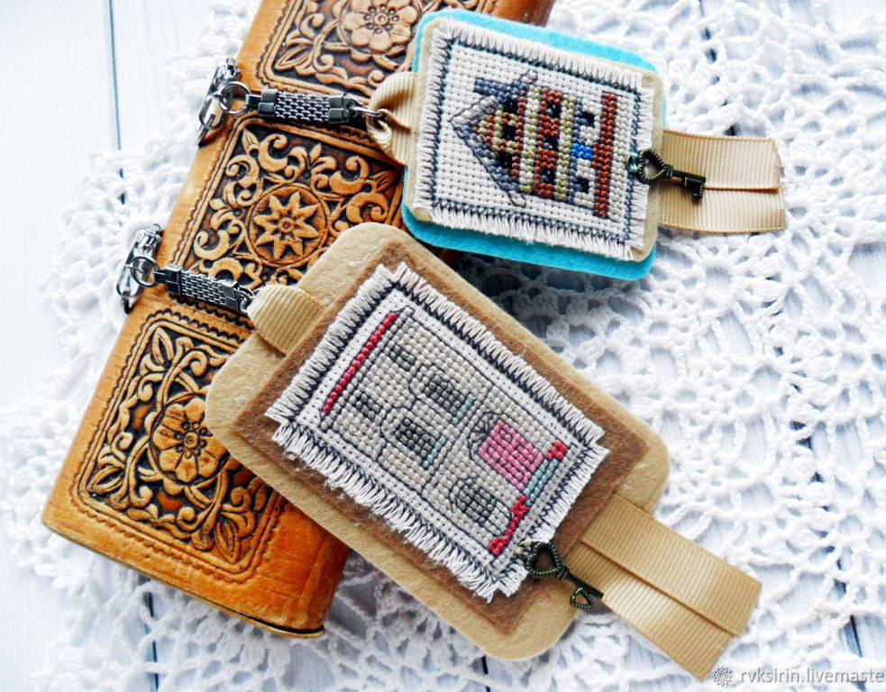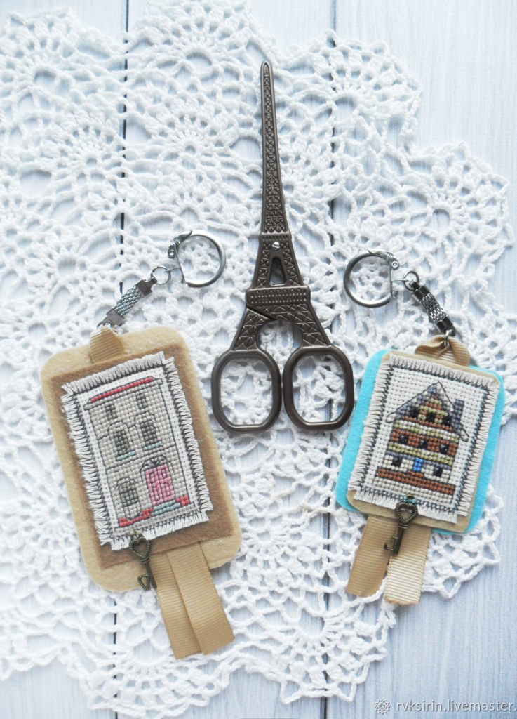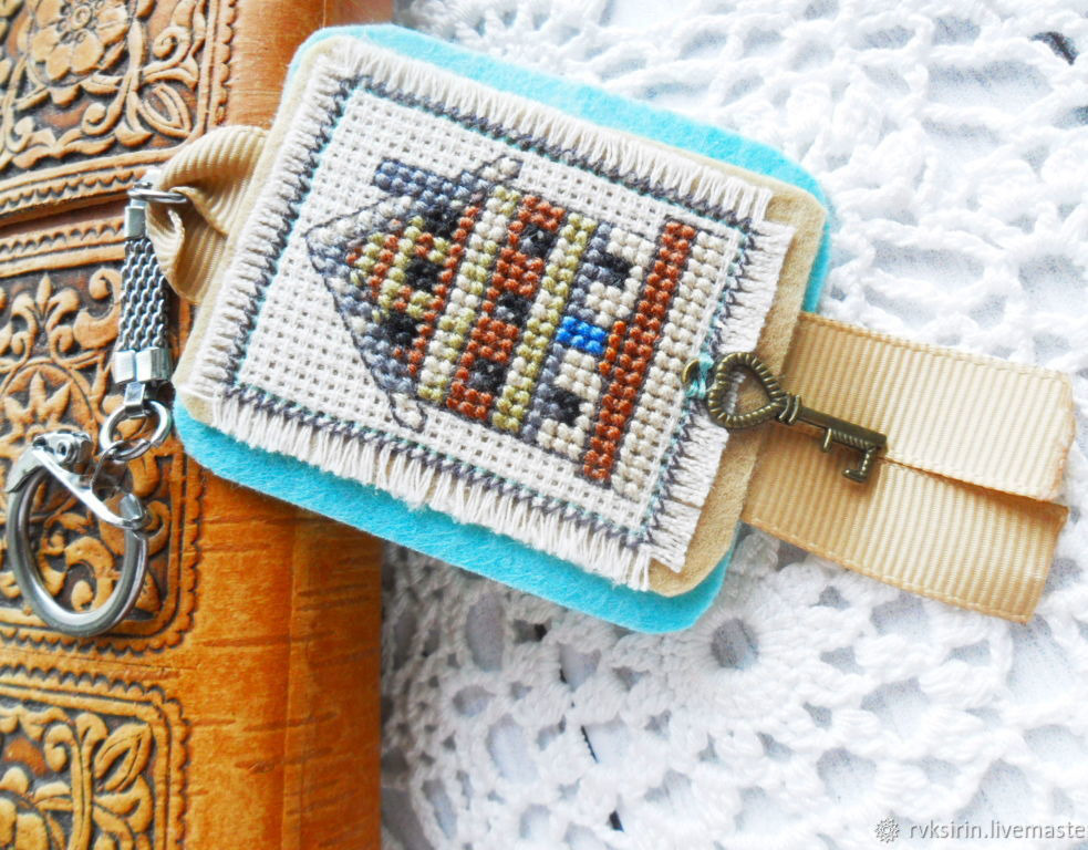 Ручная вышивка крестом выполнена на льняной канве аида 16 мулине формы Гамма. Вышивка и фетр склеены вместе паутинкой и прошиты по краю вышивки. Цепочка для брелка прочно держится на репсовой ленте, проходящей между двумя слоями фетра.