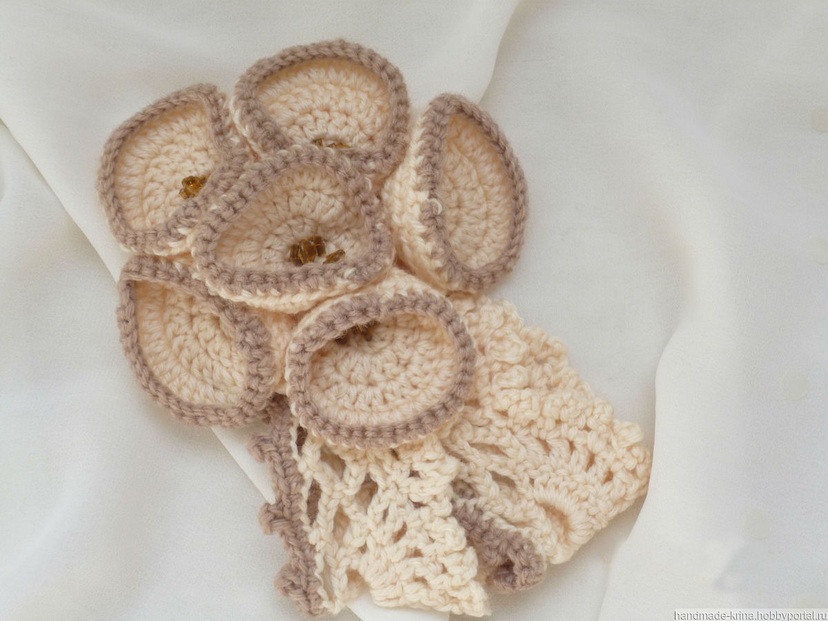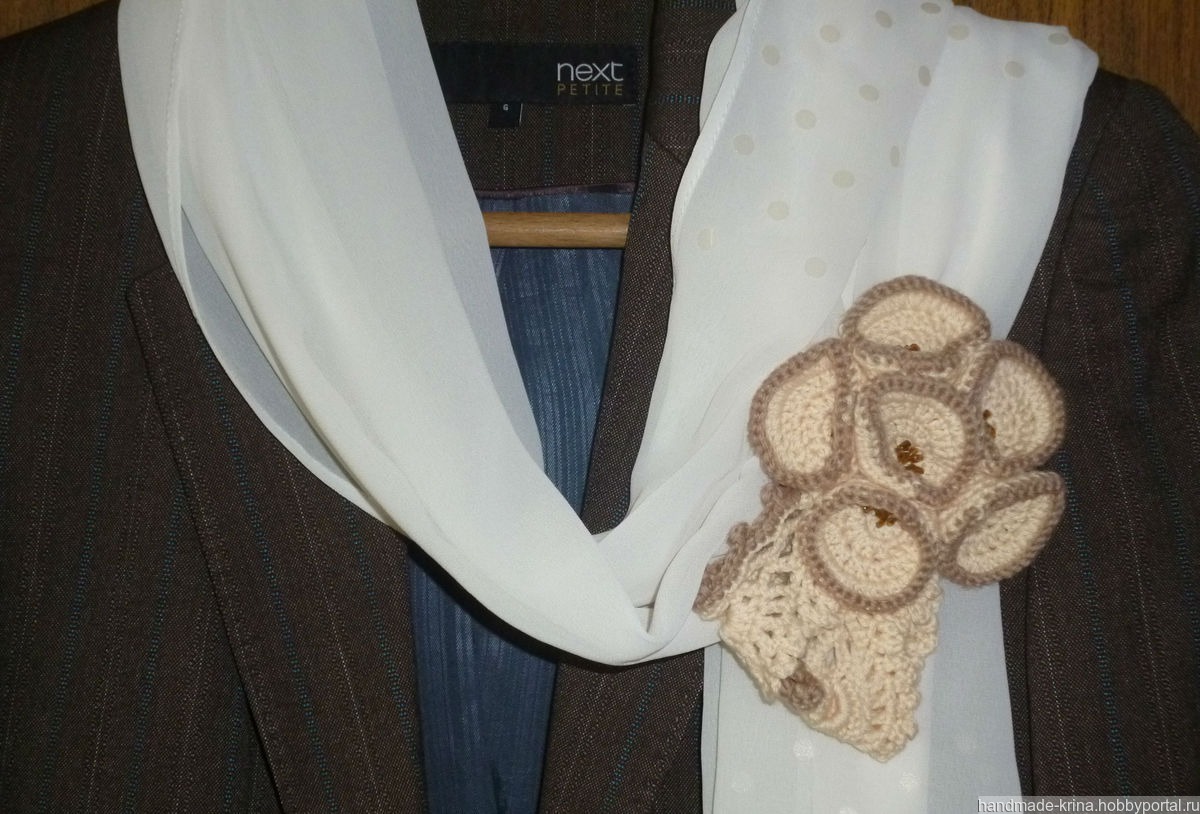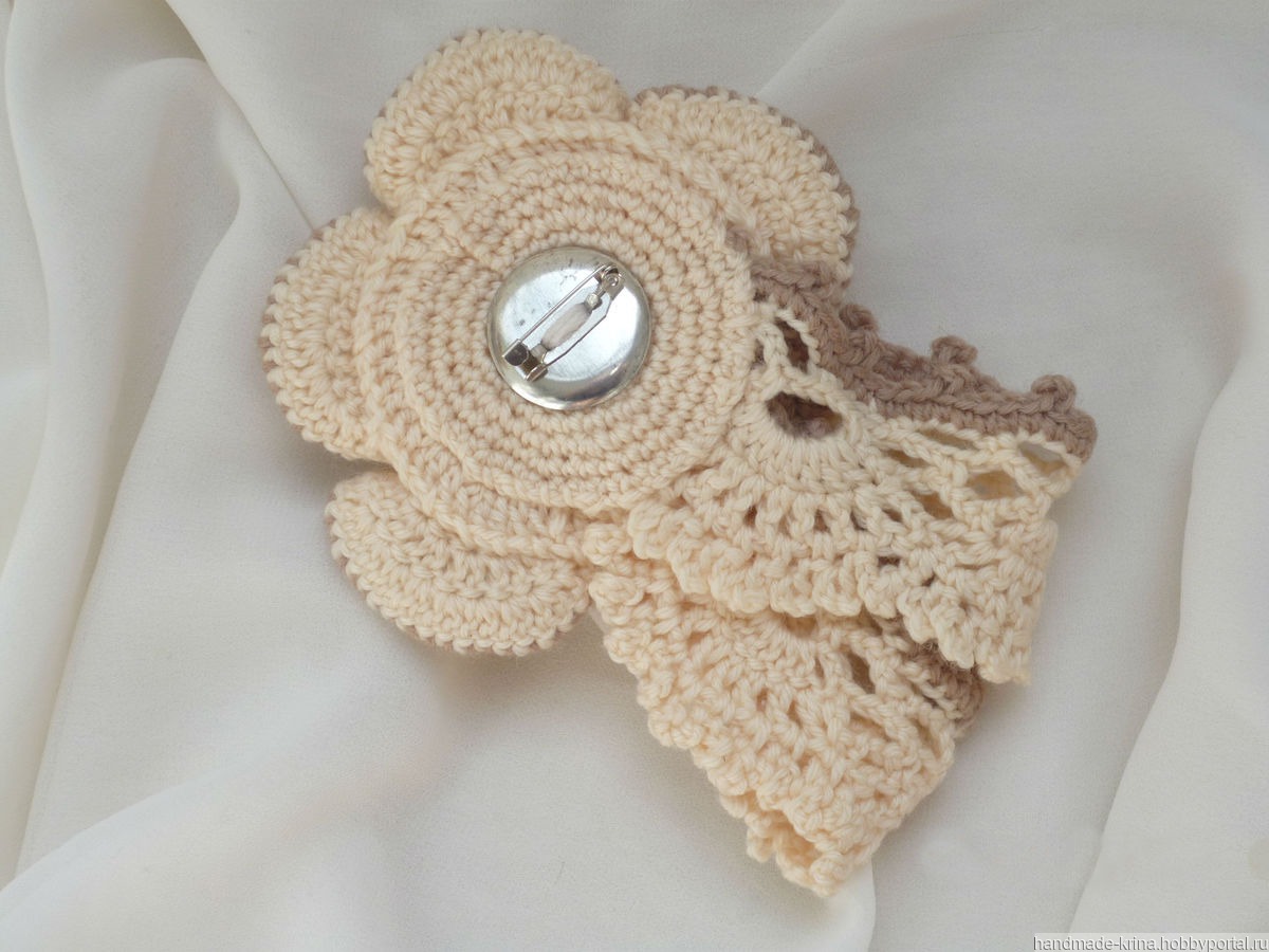 Оригинальная, нежная брошь крючком кремового цвета. Брошь украсит любую блузку. платье, шарф. Украшена бисером.