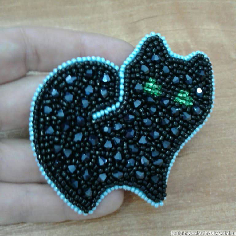 Брошь кошка, вышивка бисером и бусинами на фетре