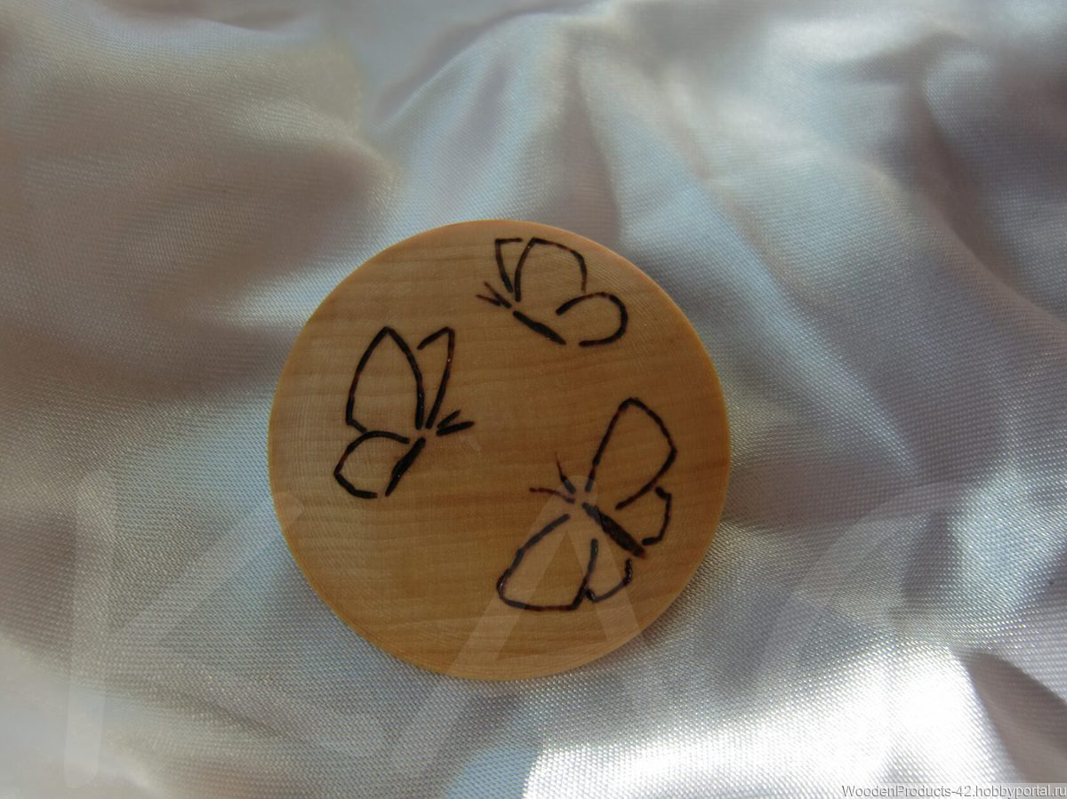 Рисунок бабочек на броши выполнен в технике - пирография. Брошь из дерева липы. Пропитана пчелиным воском, что повышает устойчивость к влаге; защищает дерево от негативного воздействия грибков и микроорганизмов; укрепляет структуру дерева; сохраняет природное тепло и рельеф древесины.