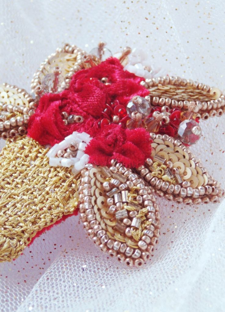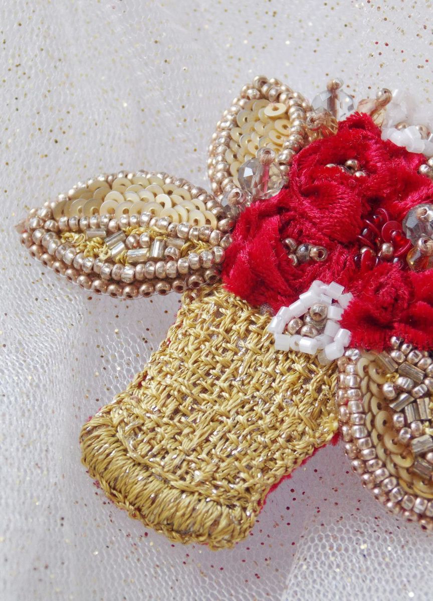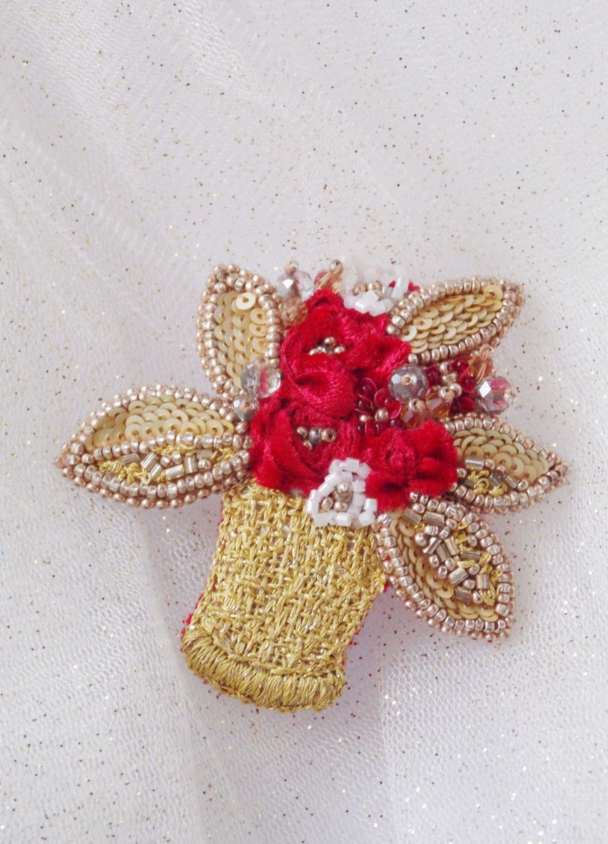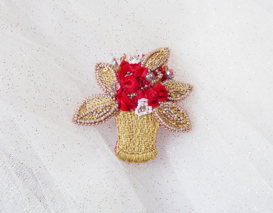 Небольшая милая брошка в виде букетика цветов. Вышита металлизированными нитками на органзе, бисером, стеклярусом, граненными бусинками и пайетками. Розочки из красного бархата. Изнанка - бархат. Застегивается на булавку для броши.
