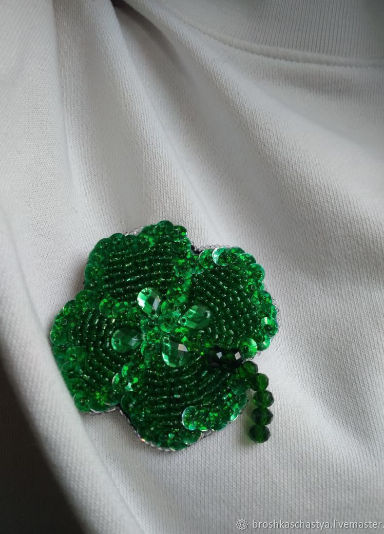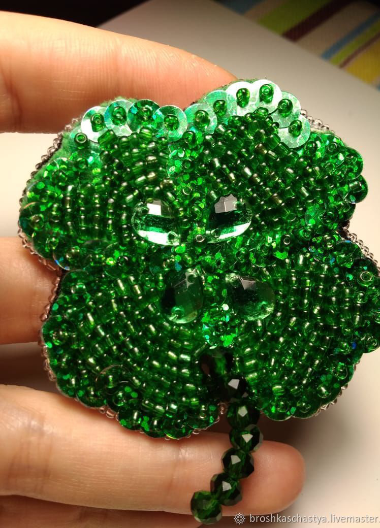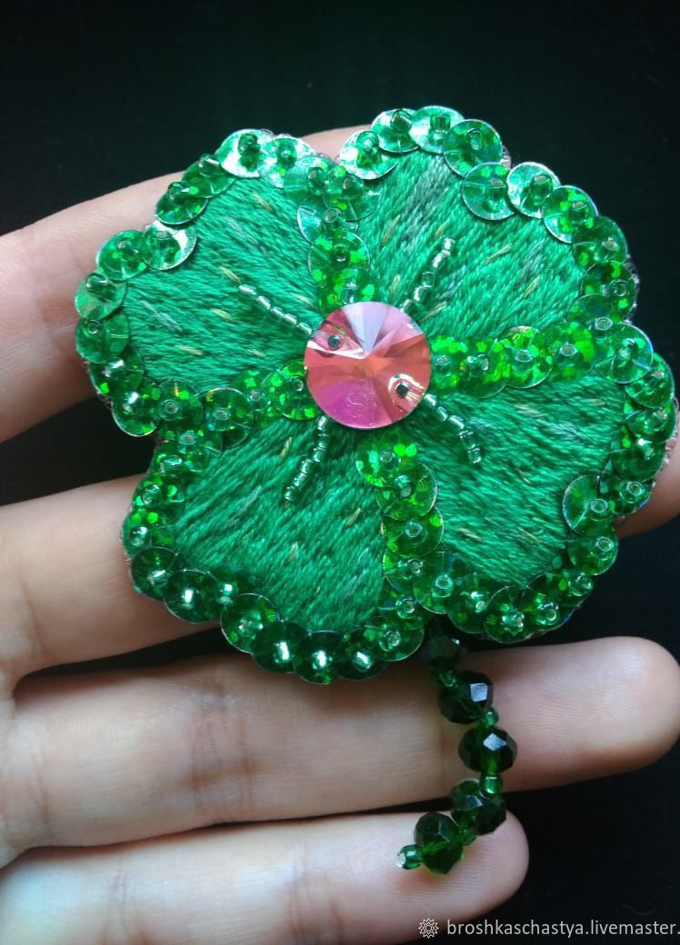 талисман, клевер, идеальный подарок, брошь ручной работы, удача, четырехлистный клевер, брошь из бисера, брошь в подарок, клевер на удачу, брошь вышитая, приносит удачу, клевер брошь, брошь талисман, брошь символ