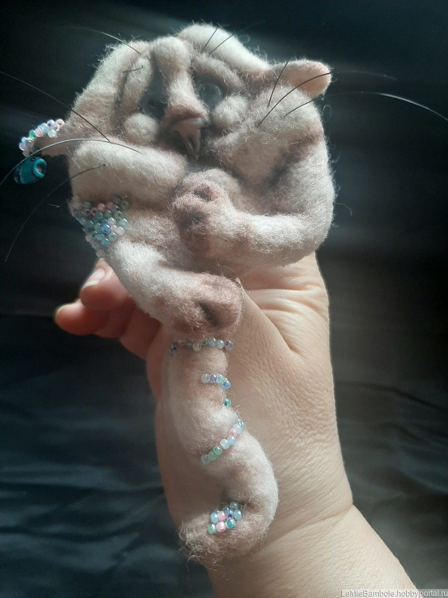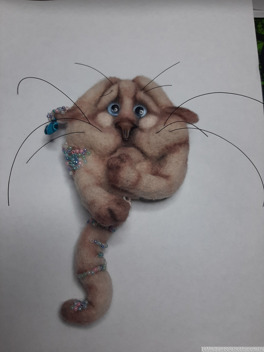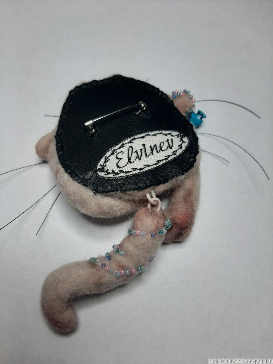 Брошь сваляна из 100% латвийского кардочеса. Глазки - стекло(Германия). Носик - запекаемая пластика. Усики - леска (Япония). Тонирована пастелью. Украшена бисером и подвеской в виде рыбки. Хвостик подвижный, каркасный (можно менять форму). Обратная сторона - натуральная кожа.