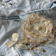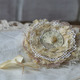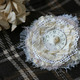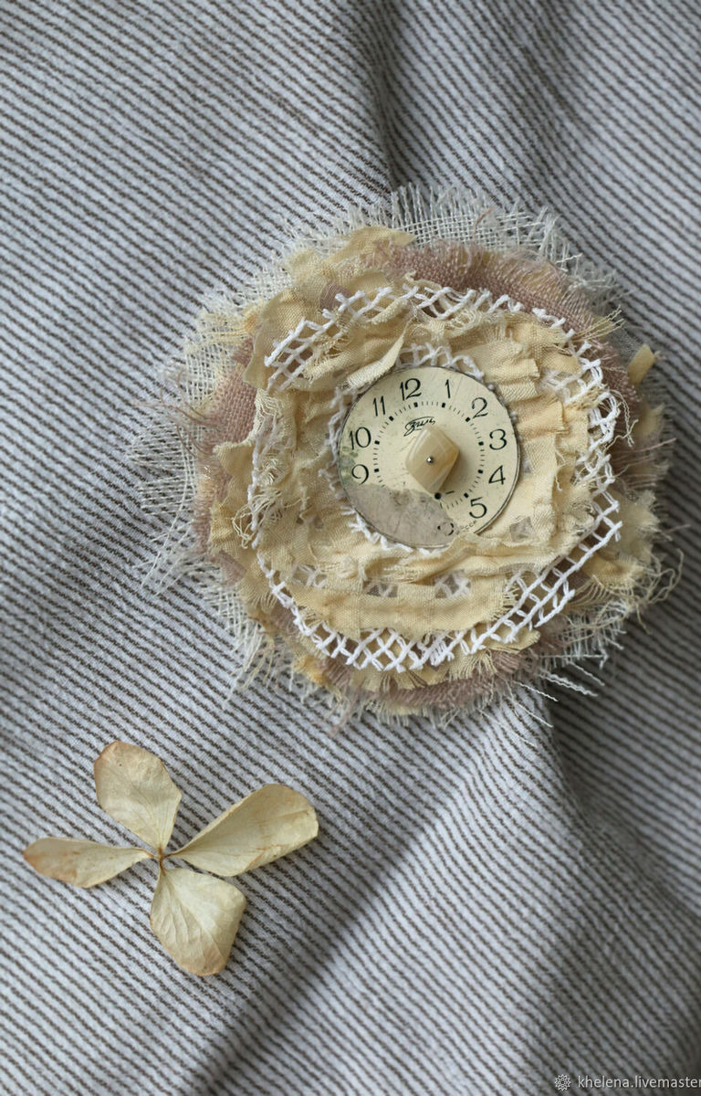 Легкая лохматая брошь собранная из винтажных тканей в оттенках молока и слоновой кости (органза, лен, хлопок) и циферблата от старых часов, закрепленного с помощью агата.