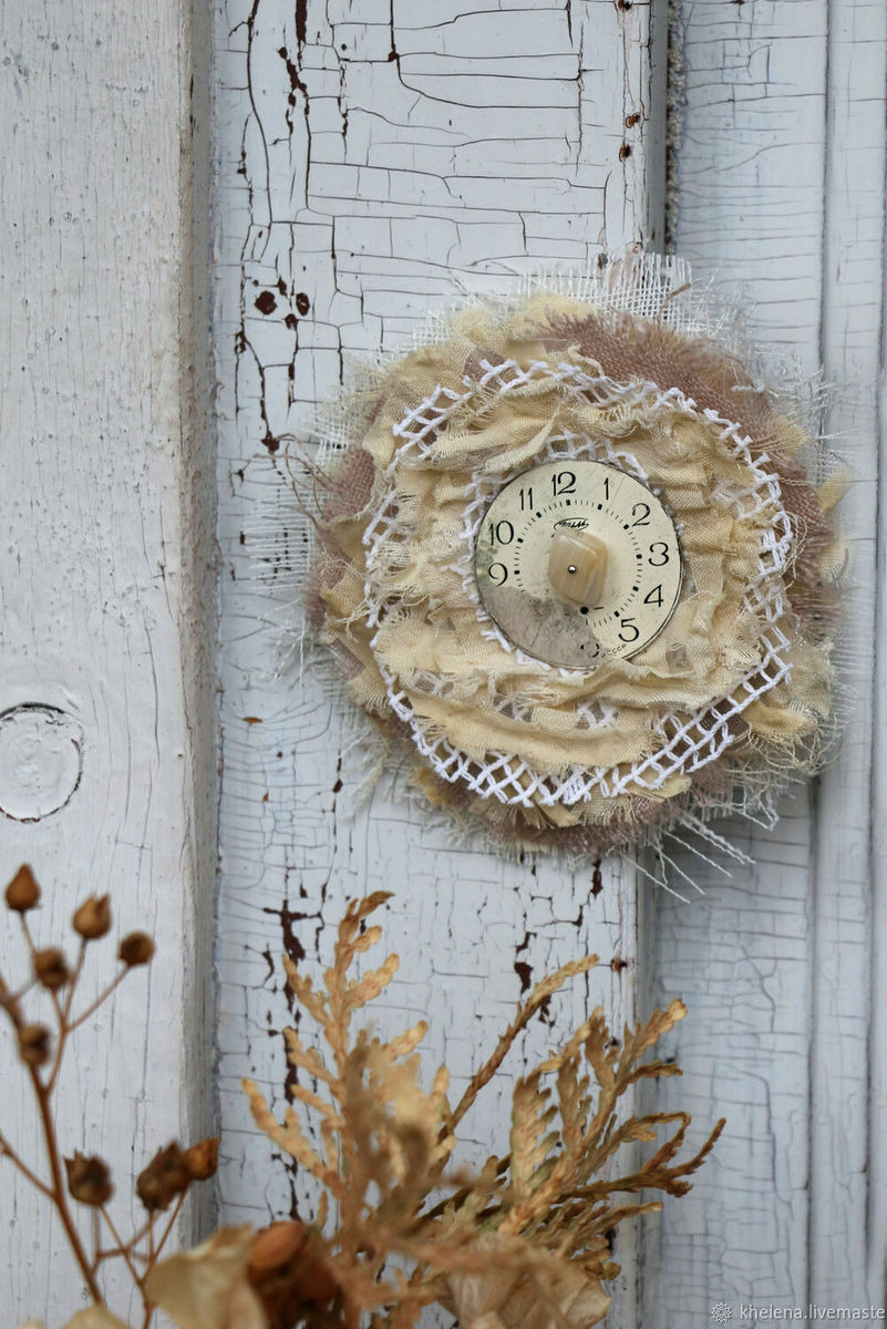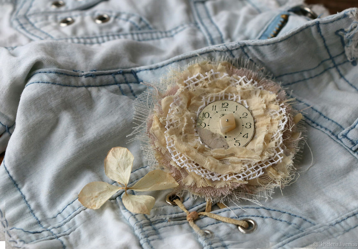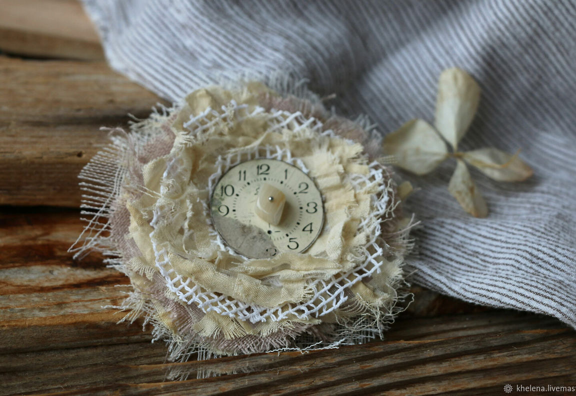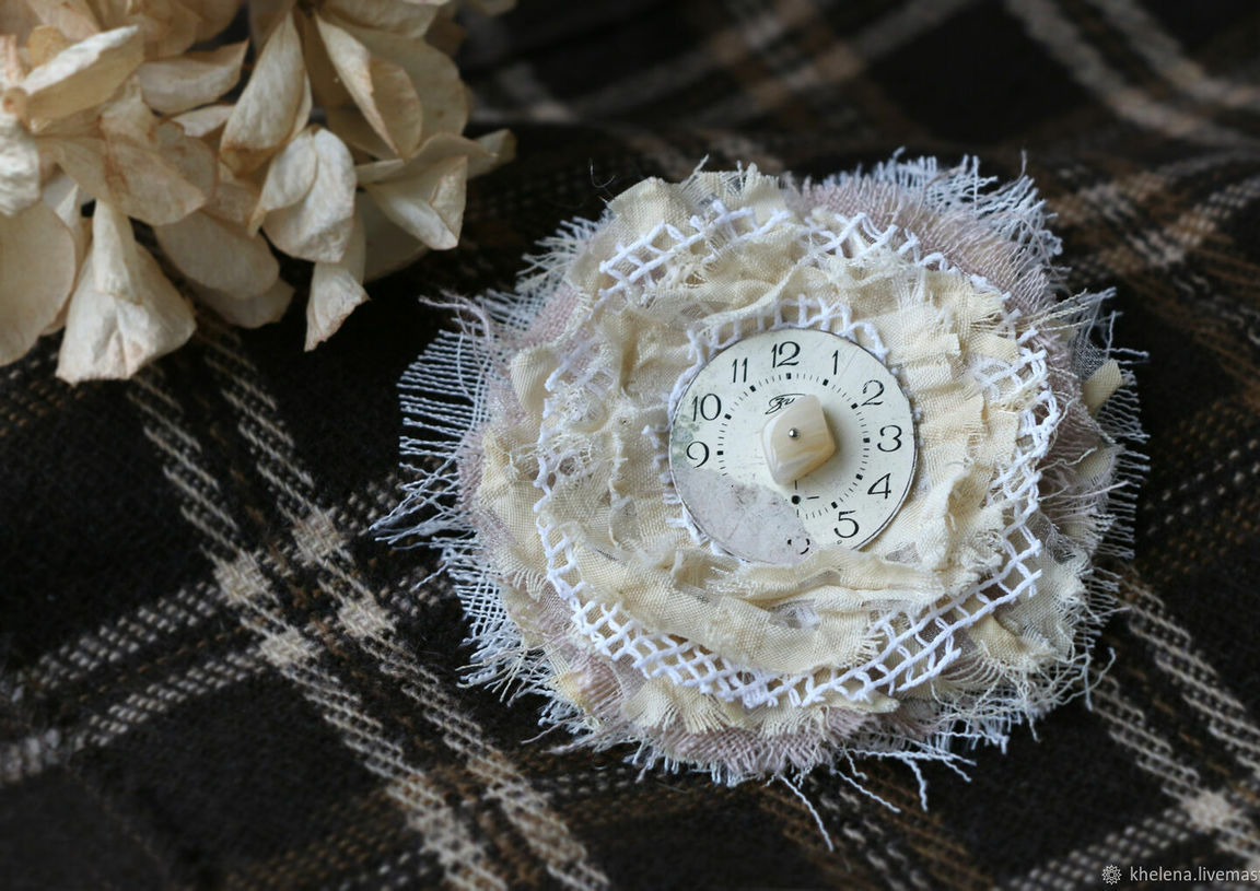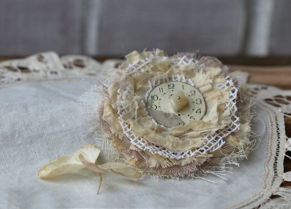 алиса, молочный цвет, стимпанк украшения, текстильная брошь, брошь на жакет, брошь в стиле шебби, стильная брошка, старые часы, брошь с циферблатом, брошь из винтажных тканей, сказочная брошь