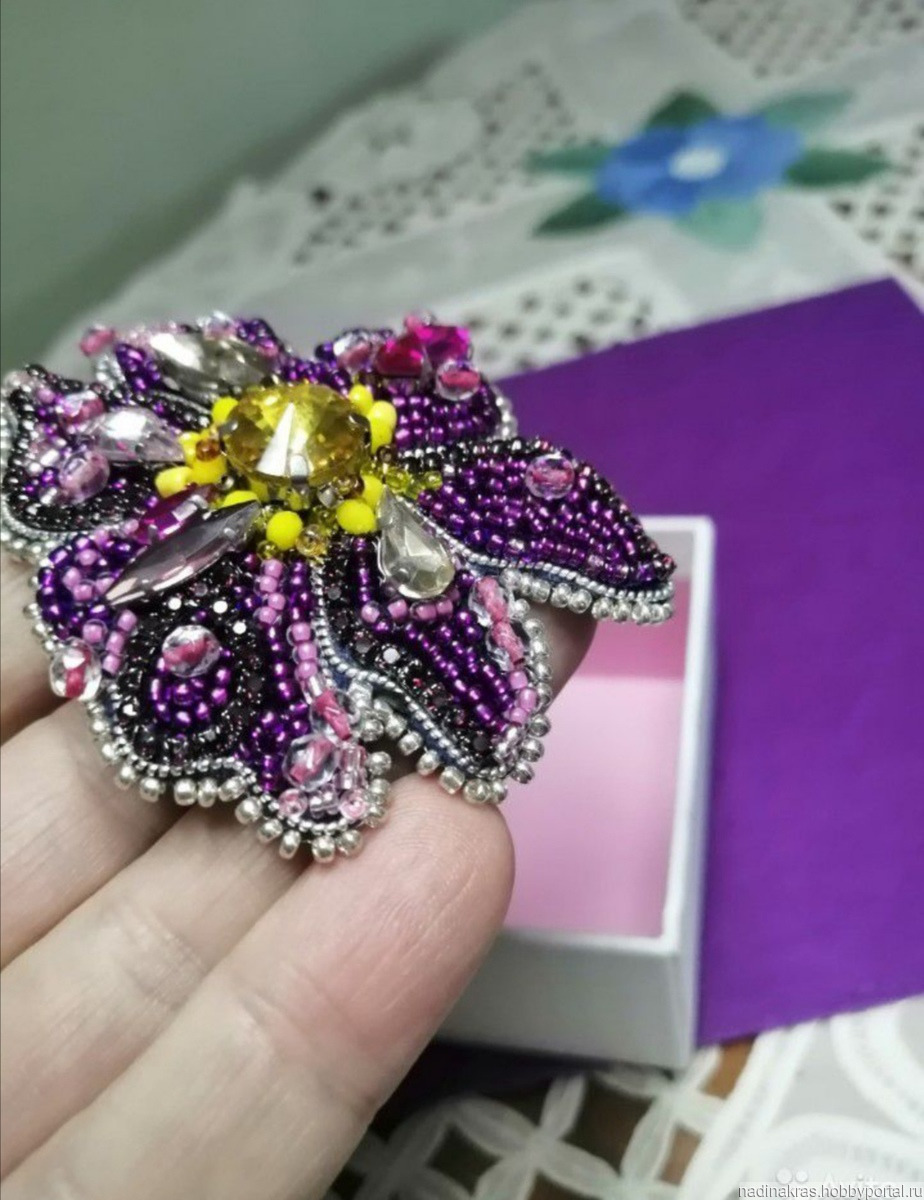 Сделана вручную из чешского, японского бисера, страз, стекл бусин, изнанка из нат кожи, булавка стальная, с защитой от растегивания