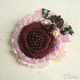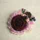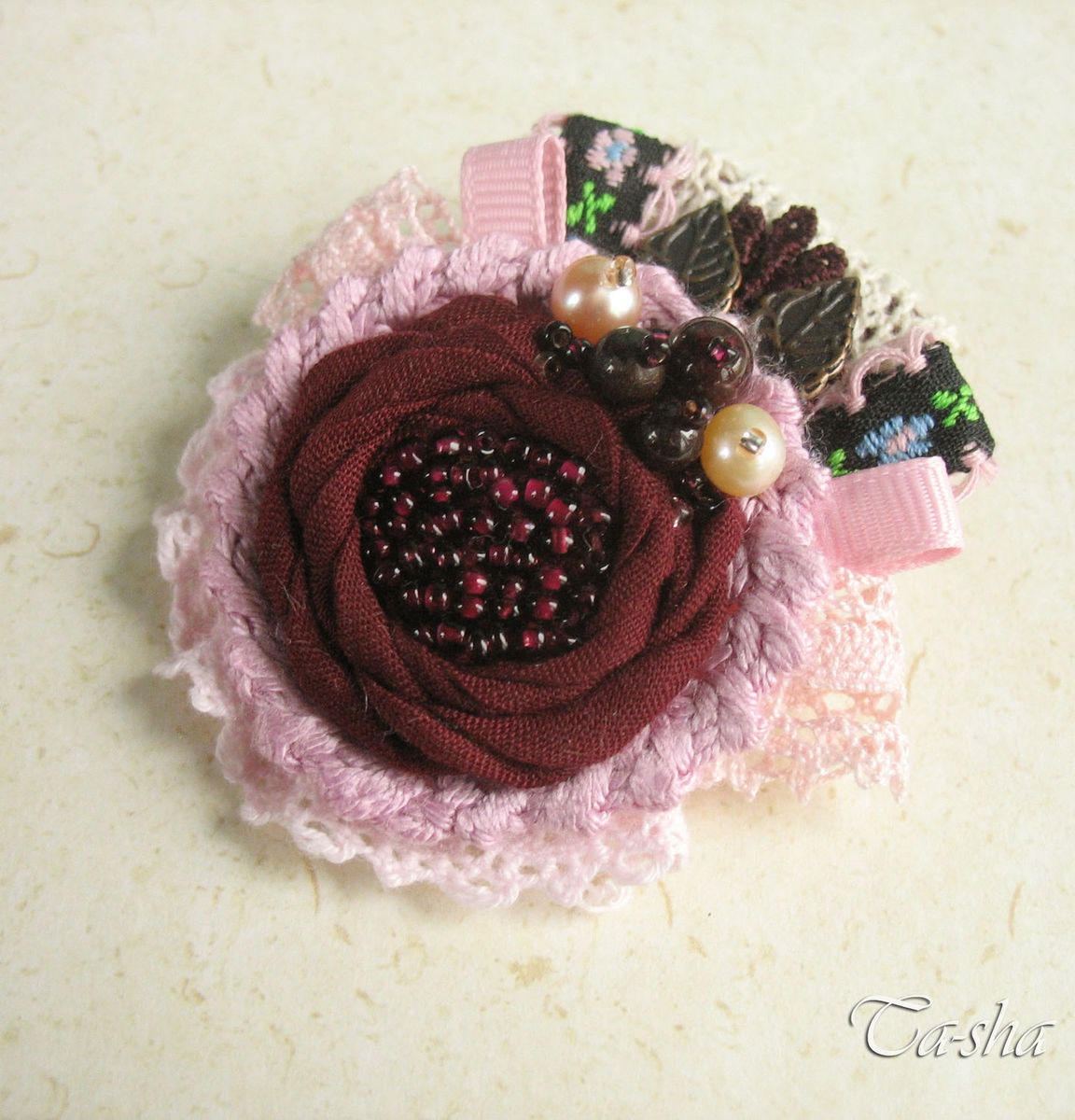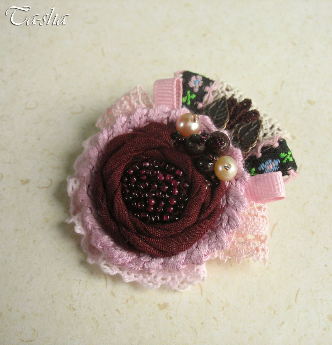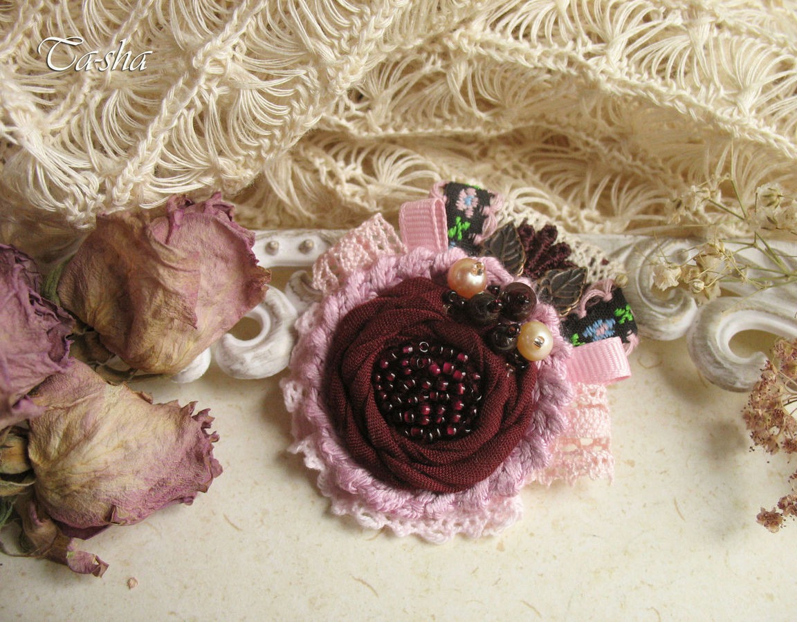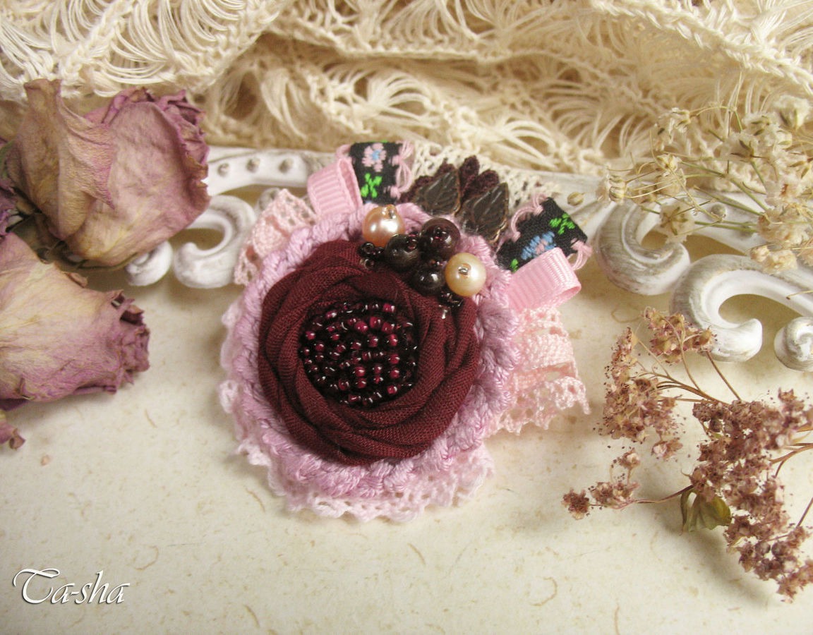 Выполнена брошь из батиста темно-бордового цвета, хлопковой пряжи и кружева. В обрамлении репсовые ленты, жаккардовая тесьма, медные листочки. Брошь расшита бисером винного цвета, украшена натуральным гранатом и пресноводным жемчугом..