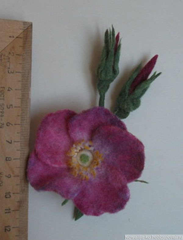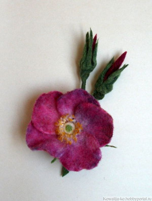 Брошь из шерсти, не предназначена для крепления на легкие ткани (шелк, шифон и т. д., если. только не будет использован зажим). Крепление может быть булавкой, может быть булавкой и зажимом вместе, иглой. Не разлохматится со временем. Середину цветка можно ароматизировать.