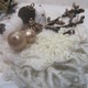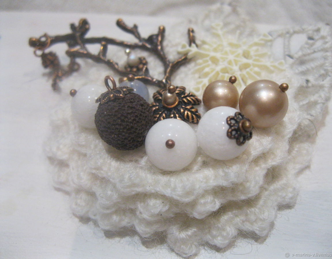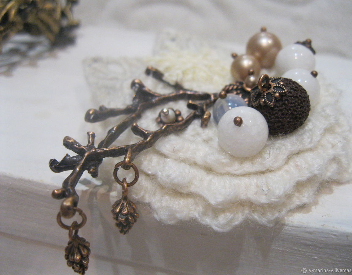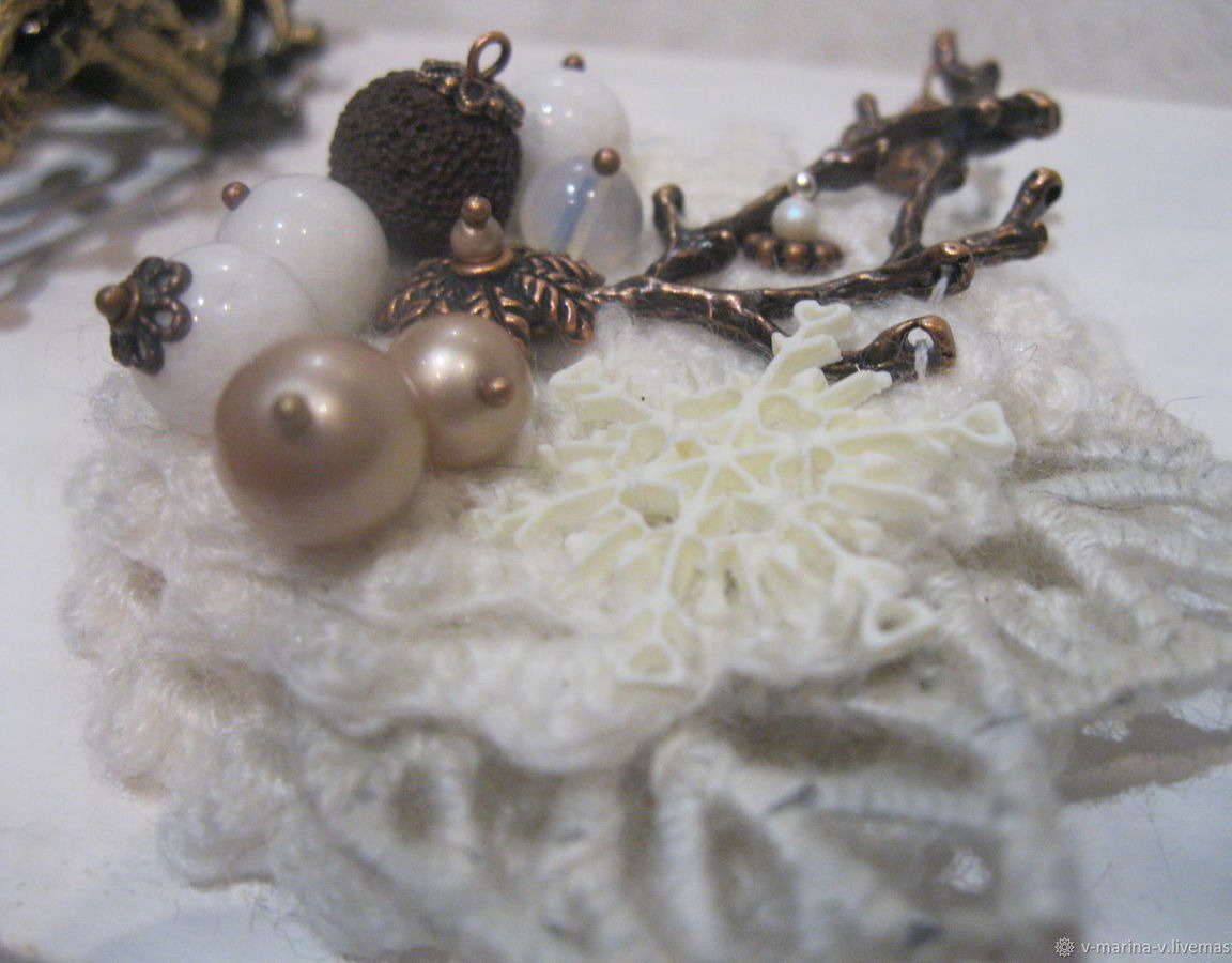 Украшена разнообразными бусинами, дополнена фурнитурой под медь и заснеженными листьями. А еще на ней поселилась фигурная снежинка и две крохотные шишечки на веточке!