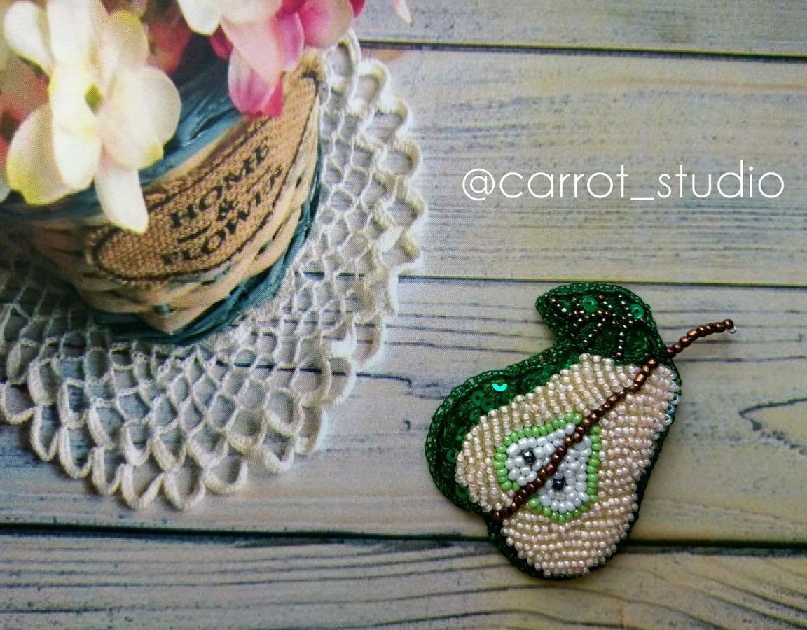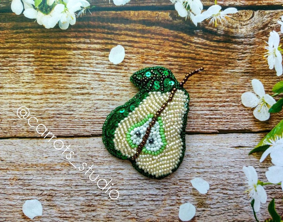 вышивка бисером, вышивка, ручная работа handmade, аксессуары ручной работы, брошь ручной работы, брошь из бисера, груша, брошка для девушки, pear, брошь груша, брошь фрукты, brooch handmade, brooch pear, фруктовые броши, carrots-studio