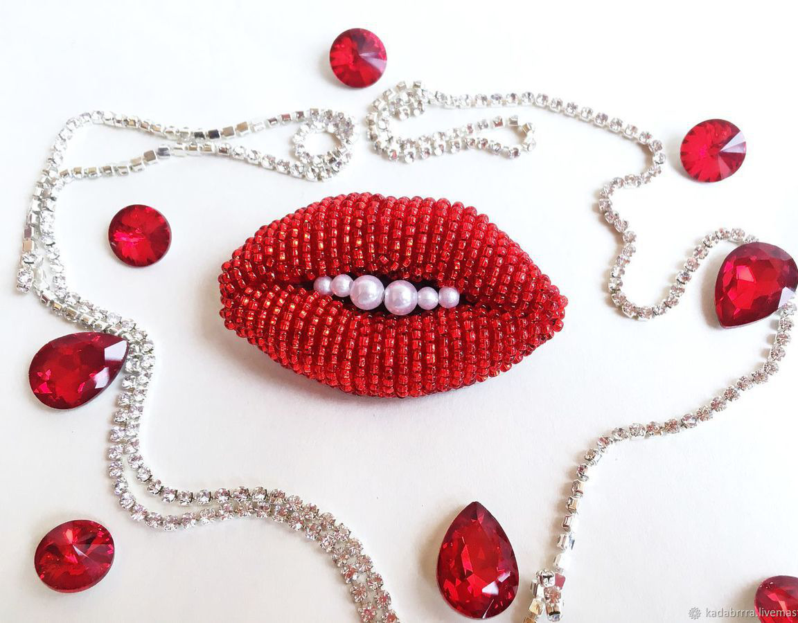 красный, брошь, клубничный, клубника, девушке подарок, губы, женщине подарок, брошь бисерная, губы брошь