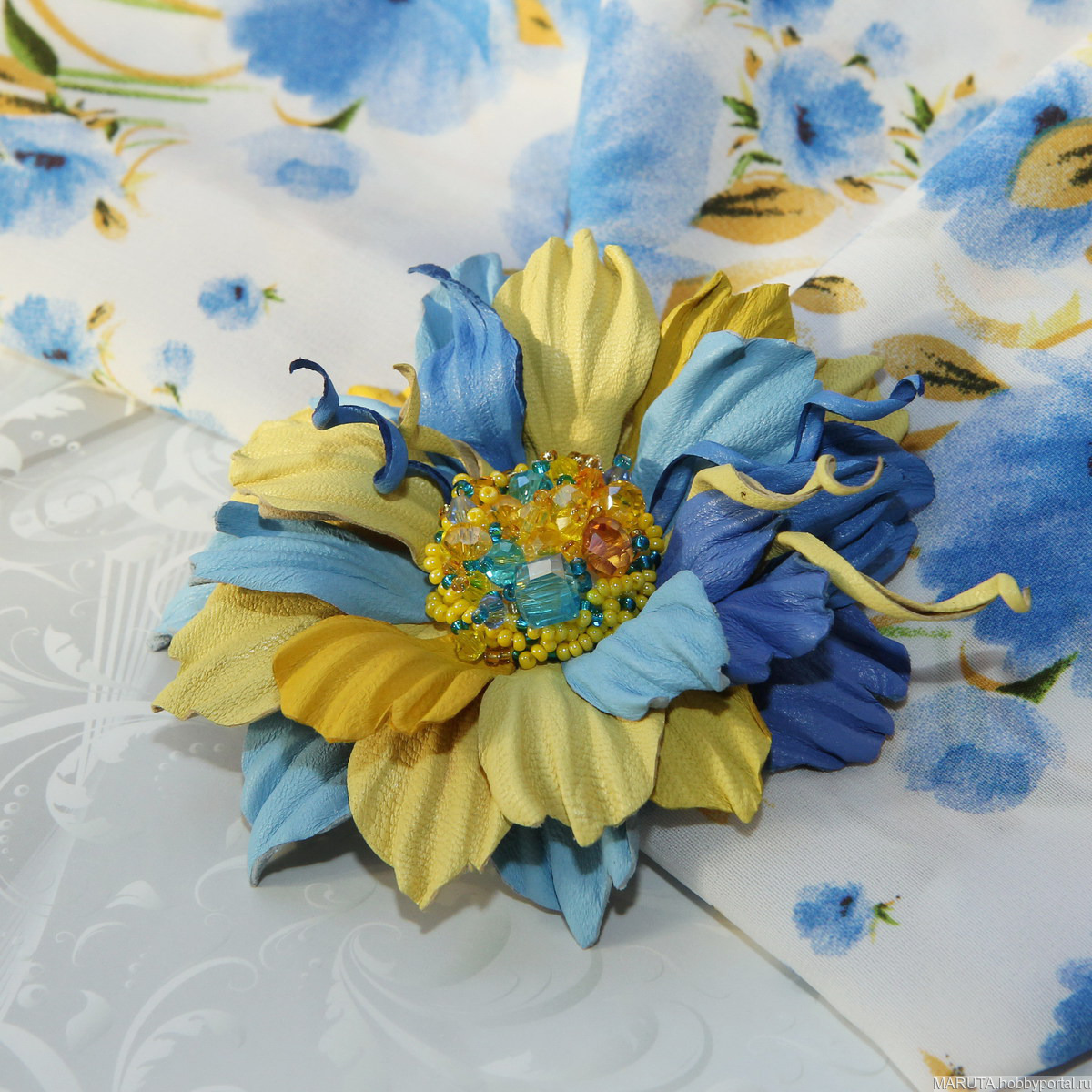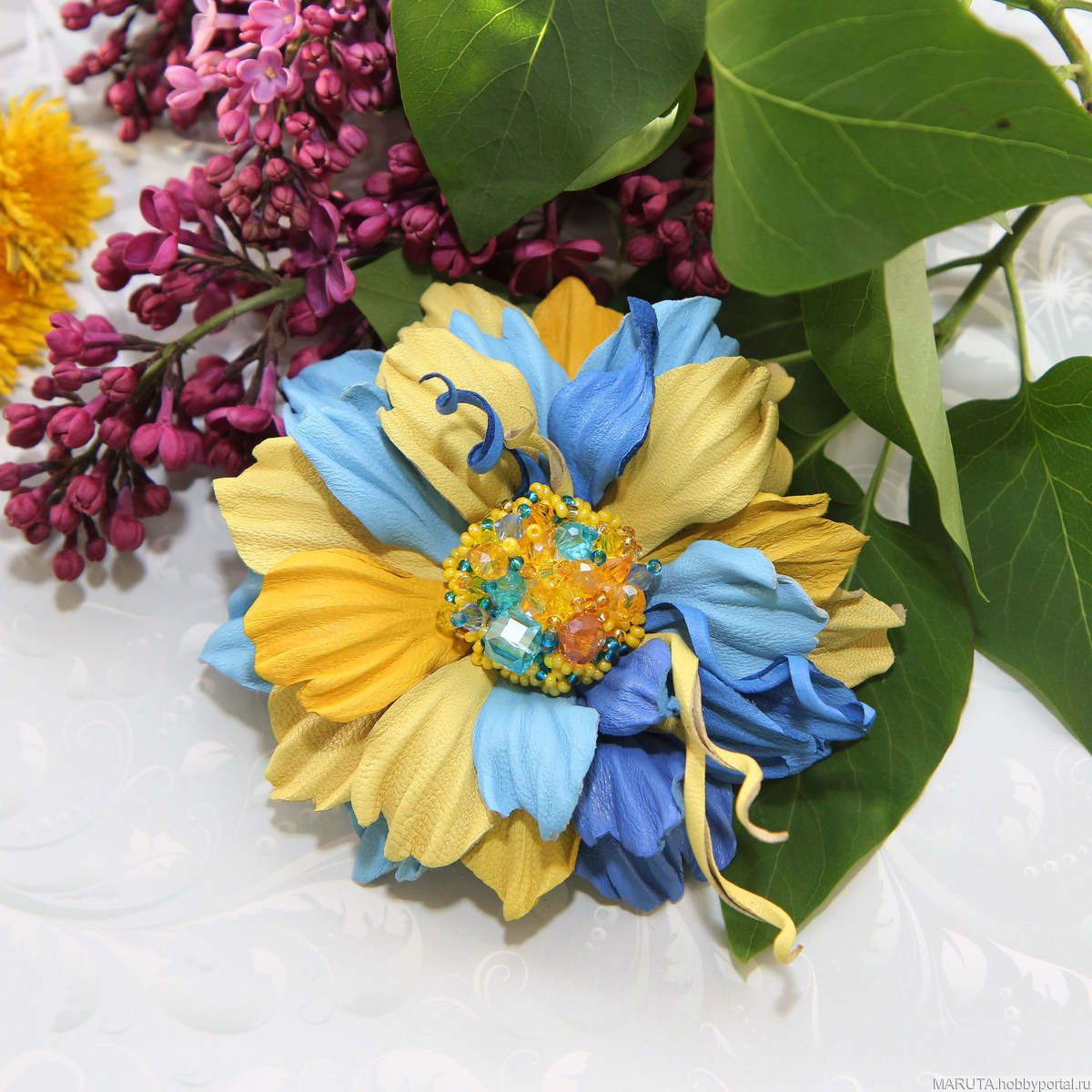 Брошь-цветок изготовлена из натуральной кожи.