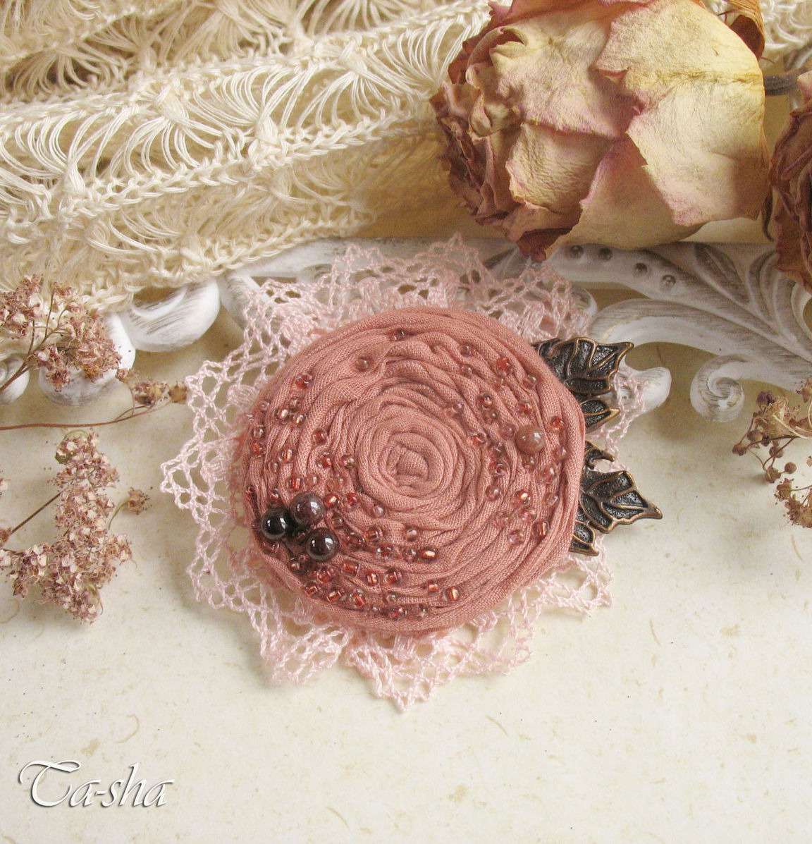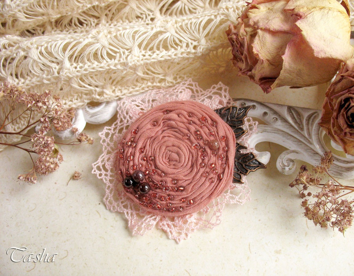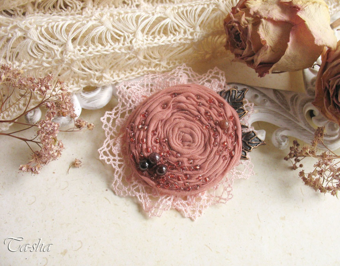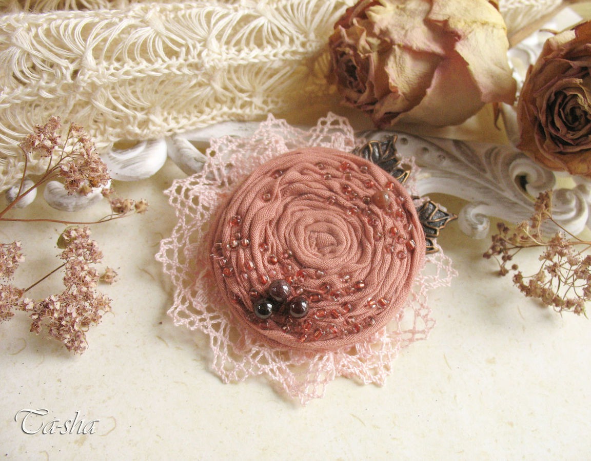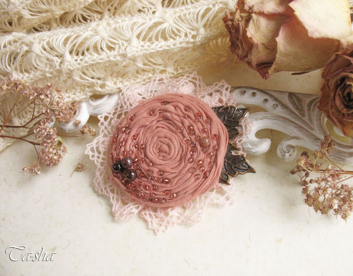 Брошь выполнена из нежного и мягкого батиста. Цвет ткани в пастельных тонах, приглушенный, розово-бежевый, как будто припудренный. В обрамлении броши хлопковое кружево. Брошка украшена бусинами граната альмандина и индийской яшмой, расшита бисером. Для декора использованы листочки медного цвета.