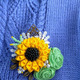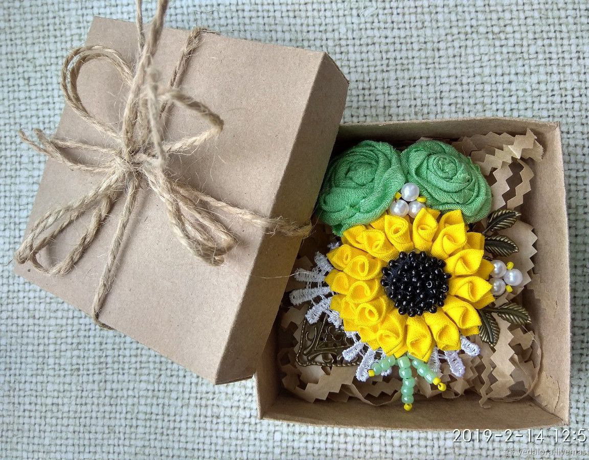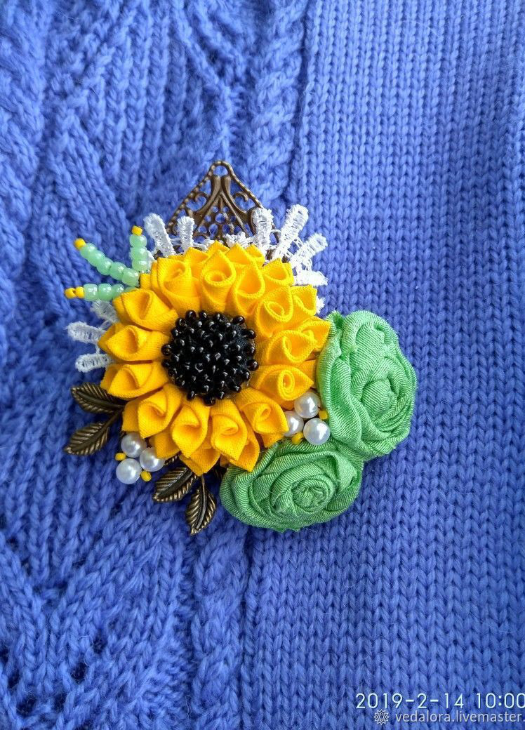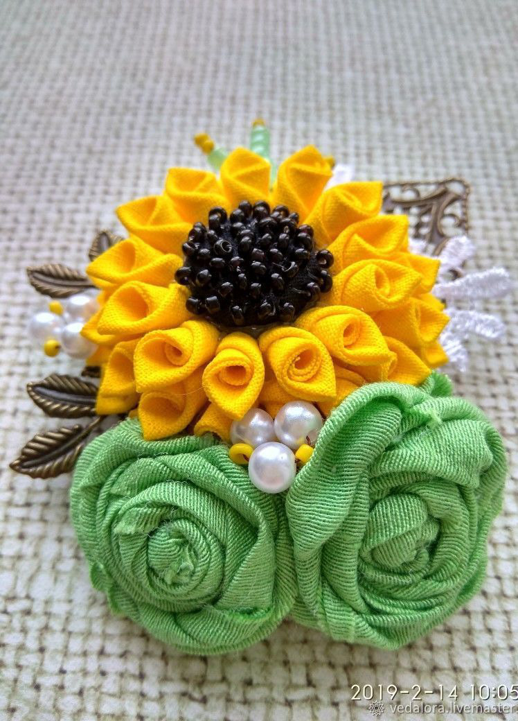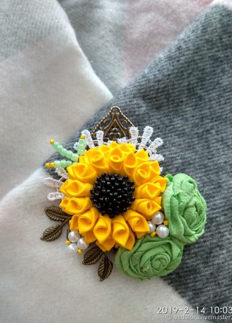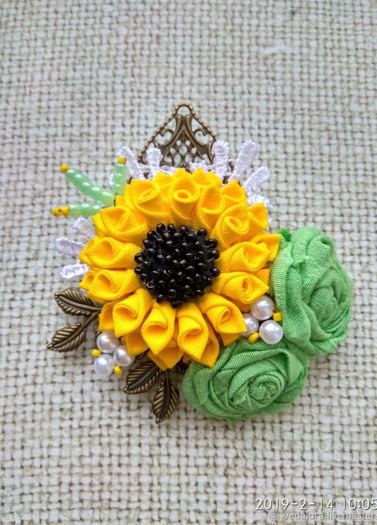 Брошь ручной работы из ткани в стиле комоно Лесной подсолнух.