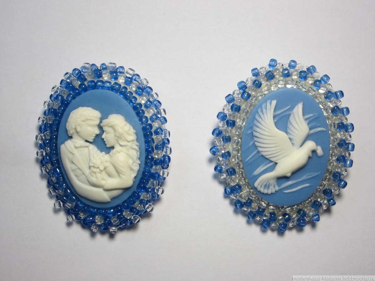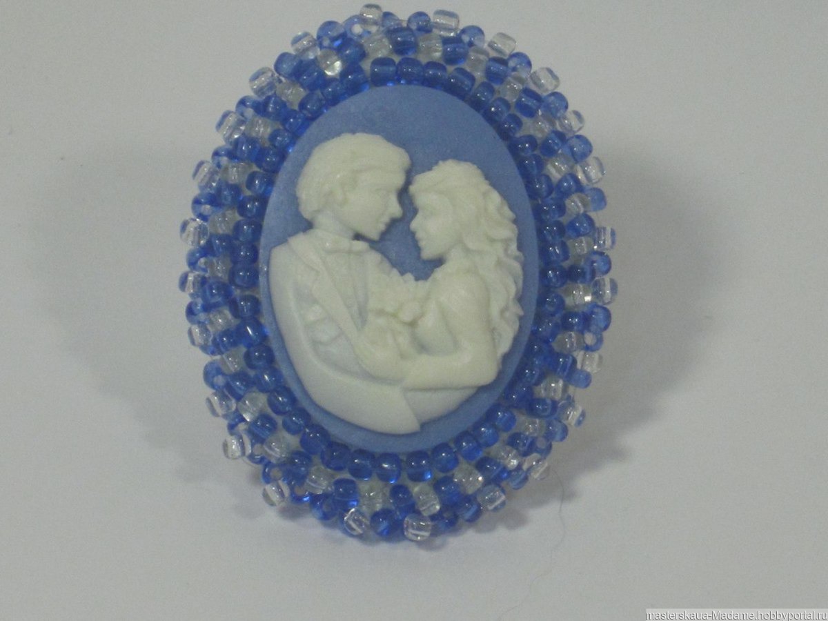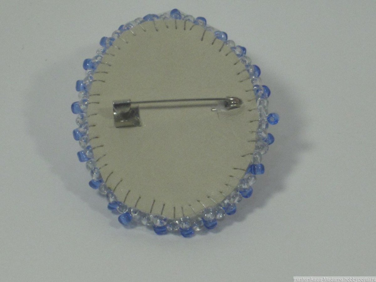 Первая оригинальная брошь "Любовь" в бело-голубых тонах. Центральная часть - акриловая камея. Обрамление - бисер двух цветов. Обратная сторона - искусственная кожа.