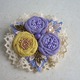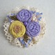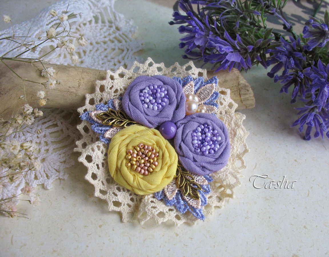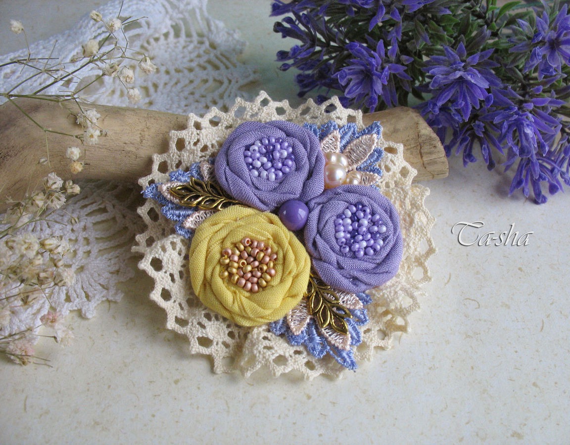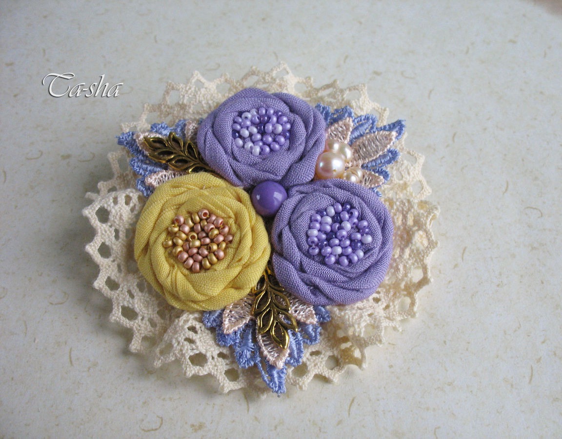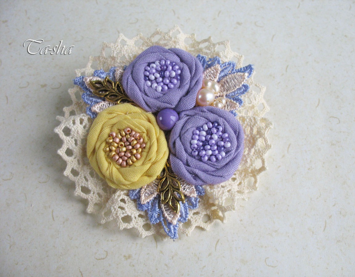 Брошь состоит из трех цветочков, сшитых из вискозы светло-лилового и желто-горчичного тонов.