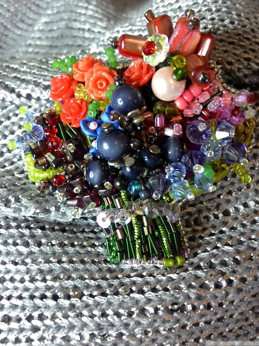 Брошь в виде букетика цветов выполнена в смешанной технике вышивки, бусины, стразы, чешский бисер.
