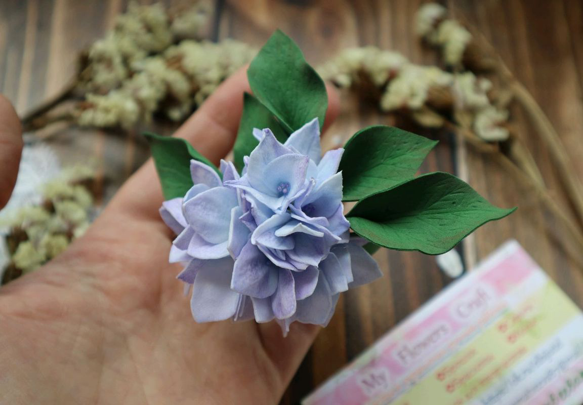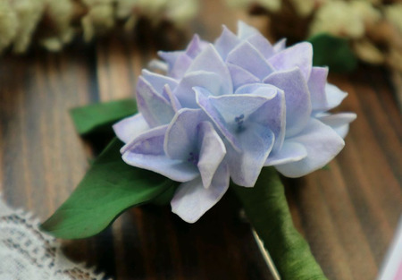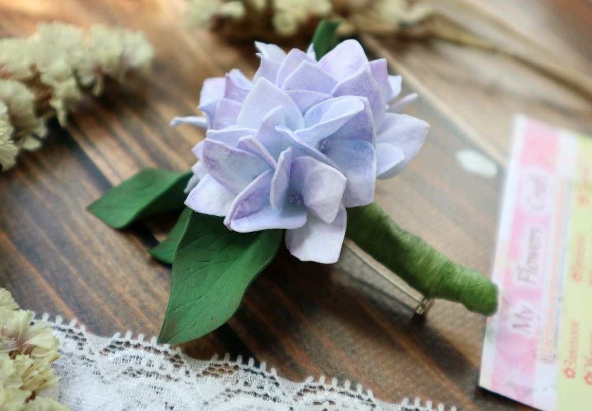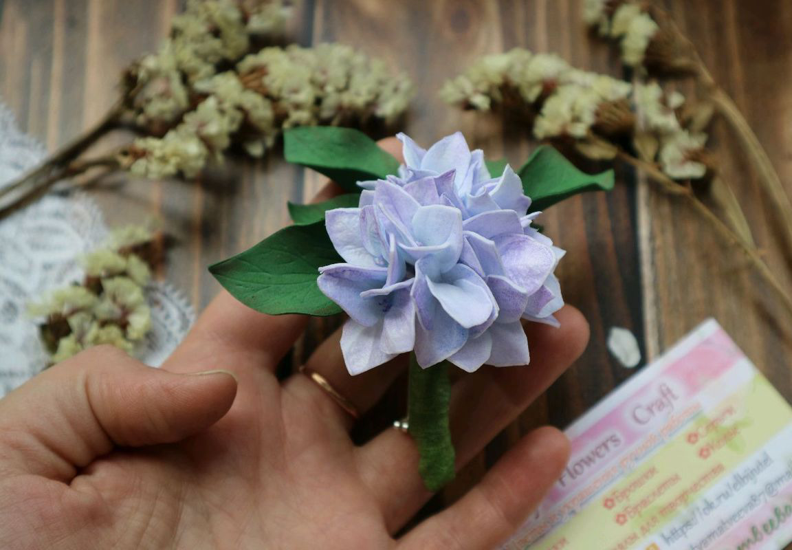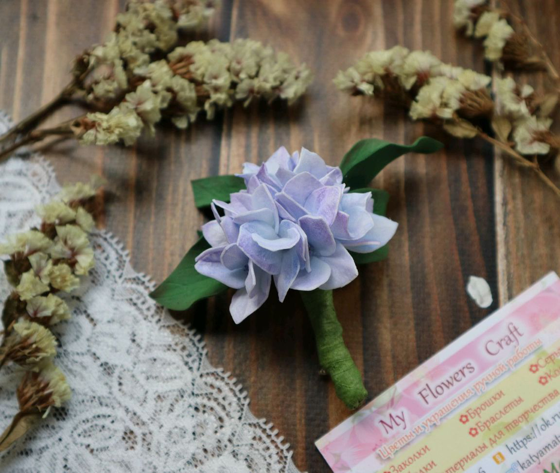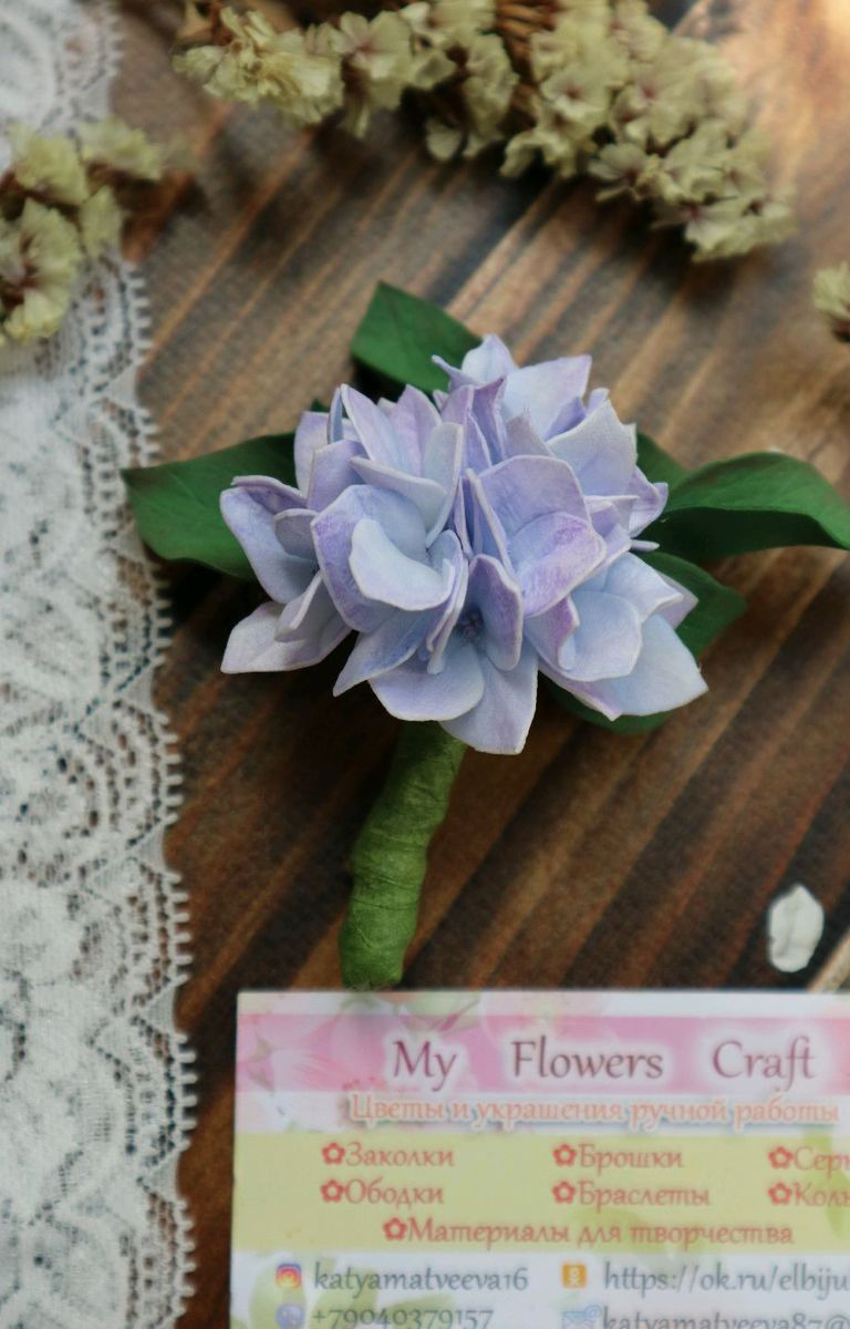 *Брошь ручной работы с цветами гортензии выполнена из фоамирана, металлической фурнитуры, проволоки и тейп-ленты, тонирована сухой художественной пастелью.