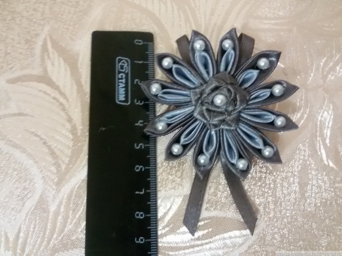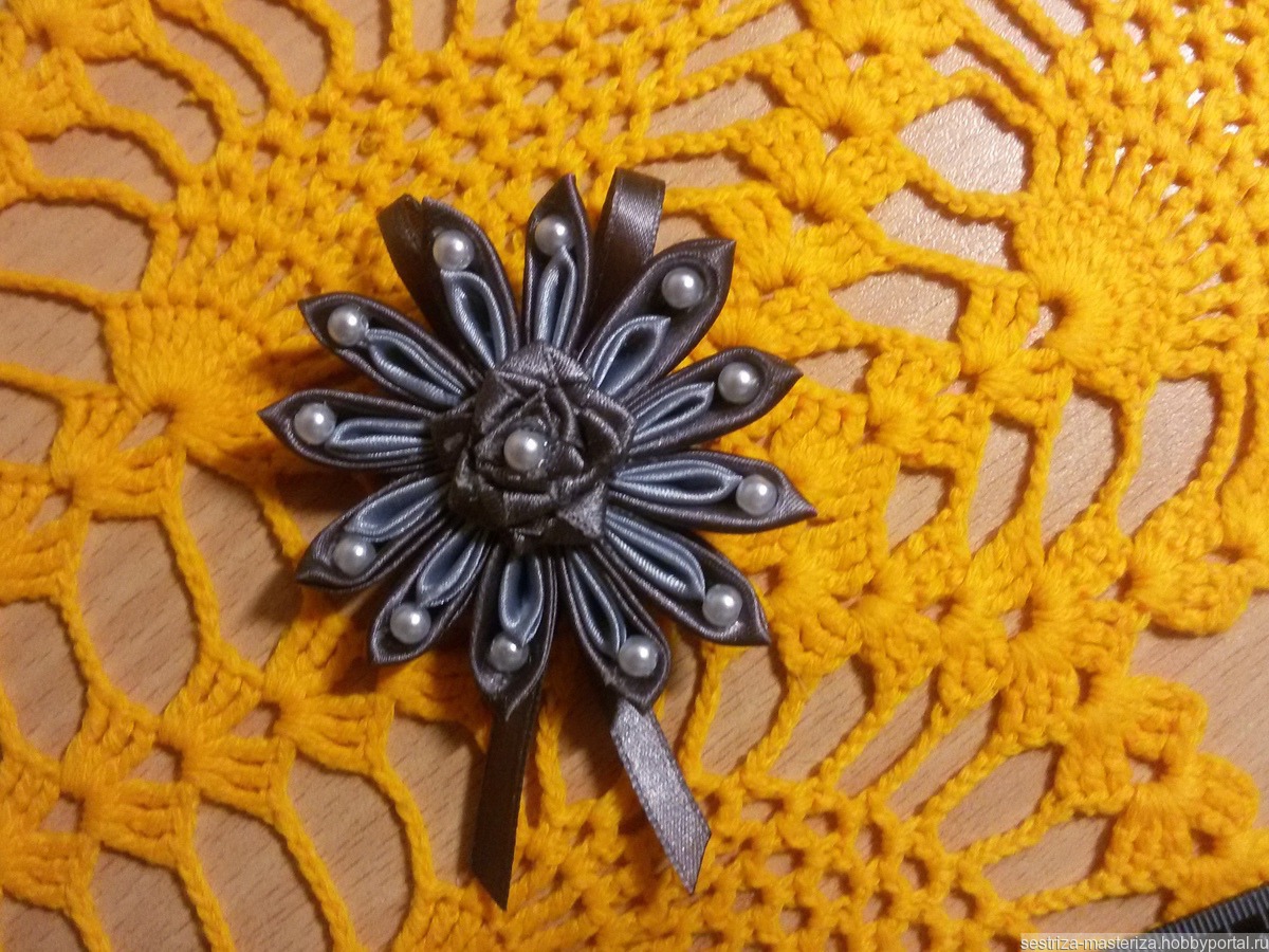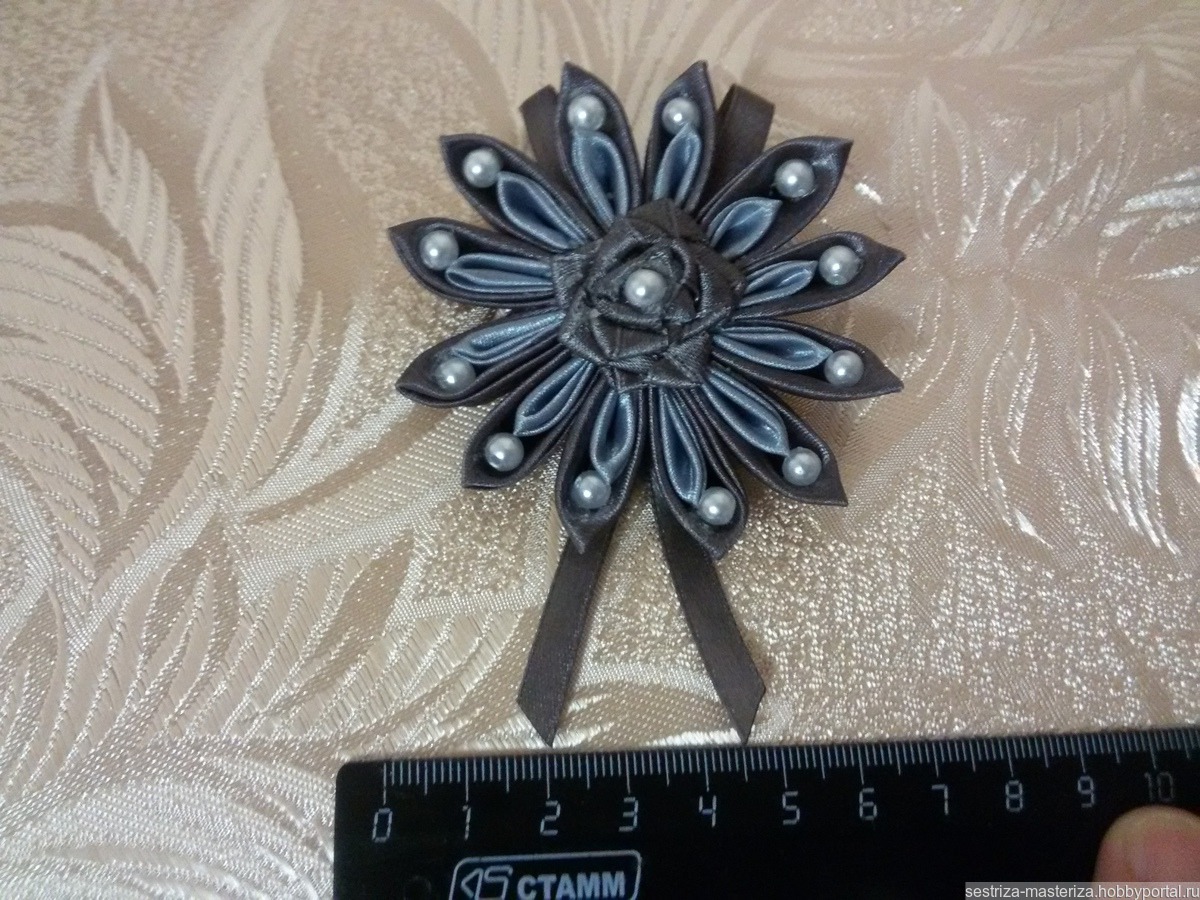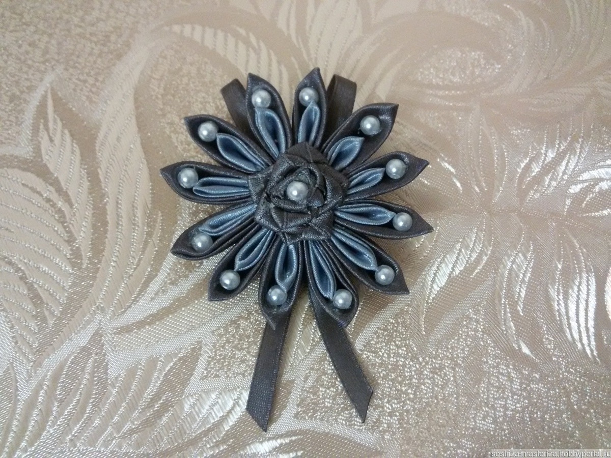 Нарядная, стильная брошка выполнена в технике канзаши, украшена бусинками под жемчуг.