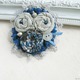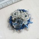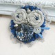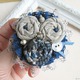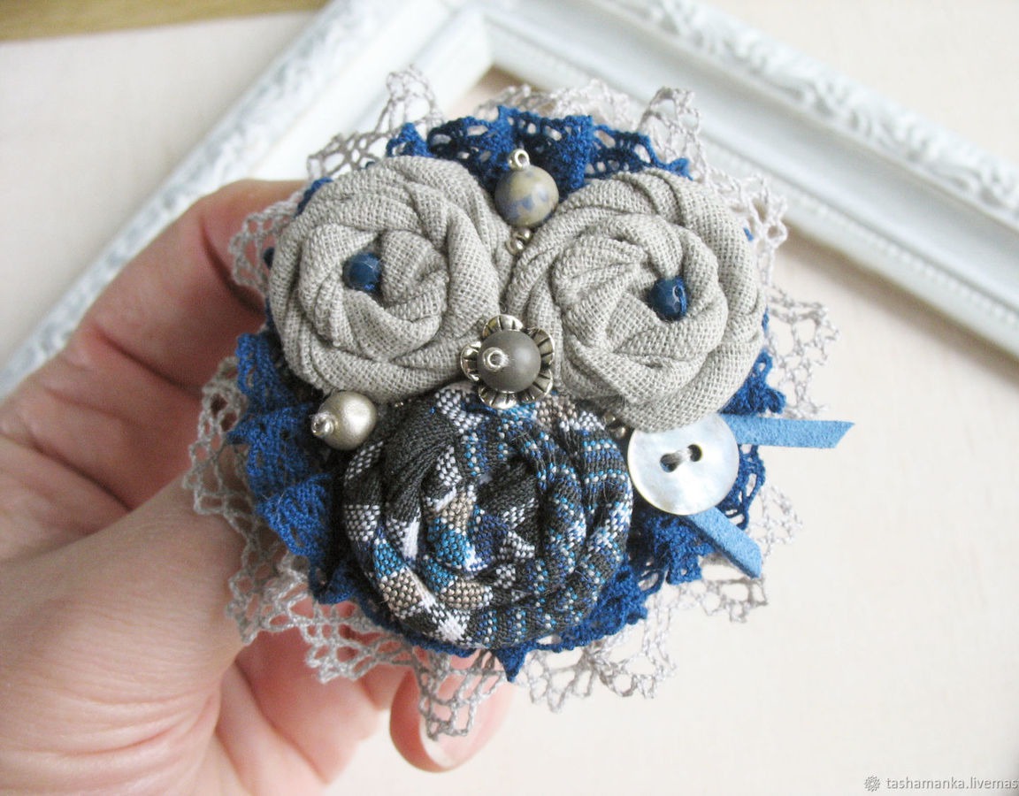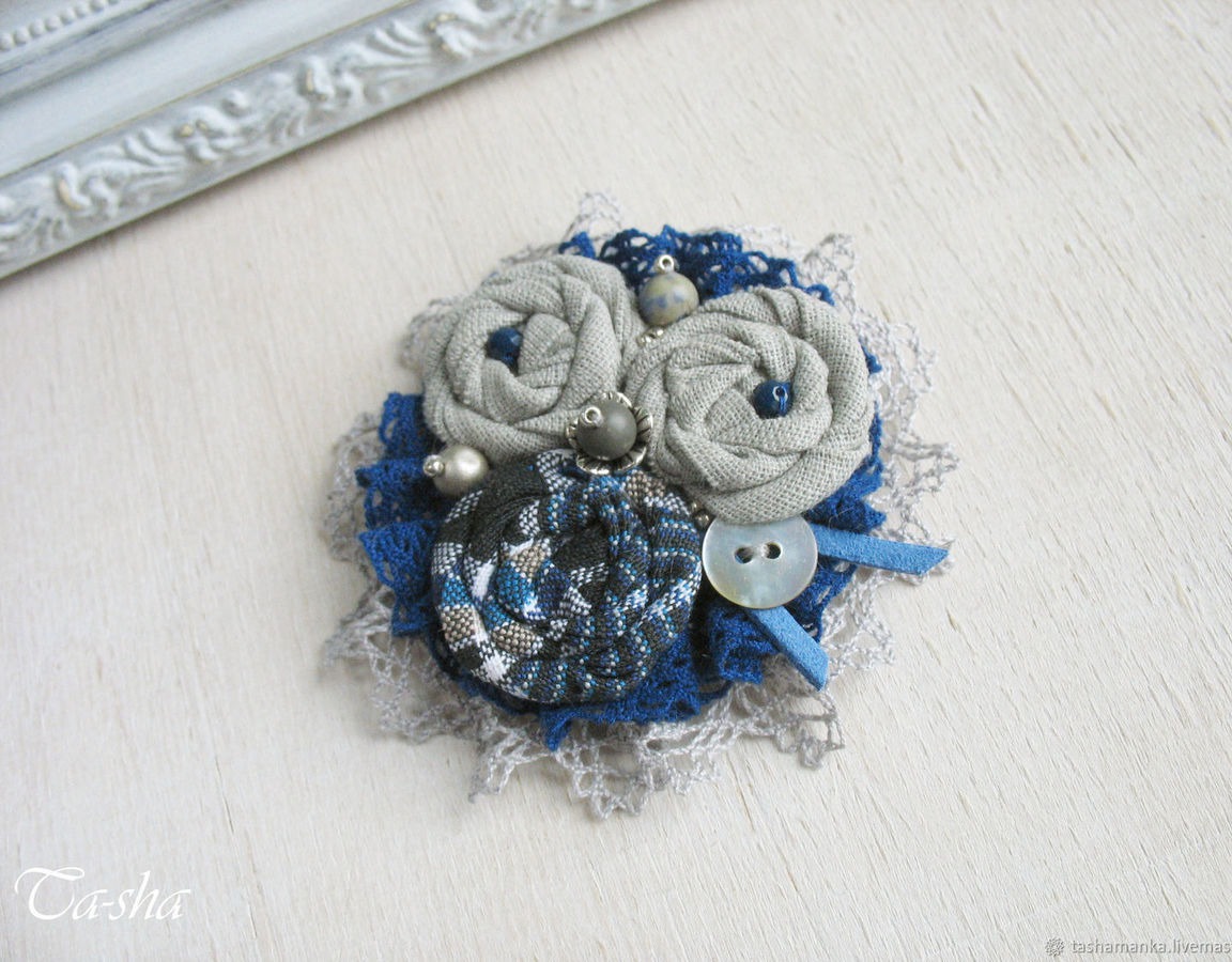 Брошь бохо, цветы из ткани. Яркий акцент на каждый день в сине-серых тонах.
