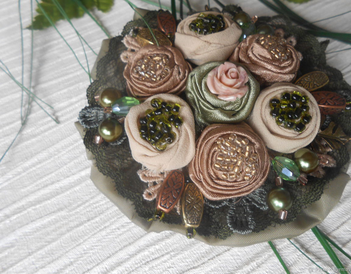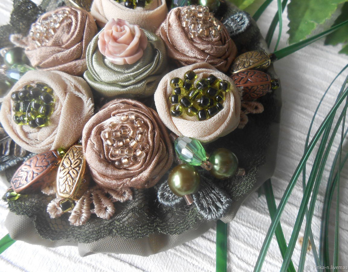Перламутровый бисер и различные бусины подобраны в тон тканей .