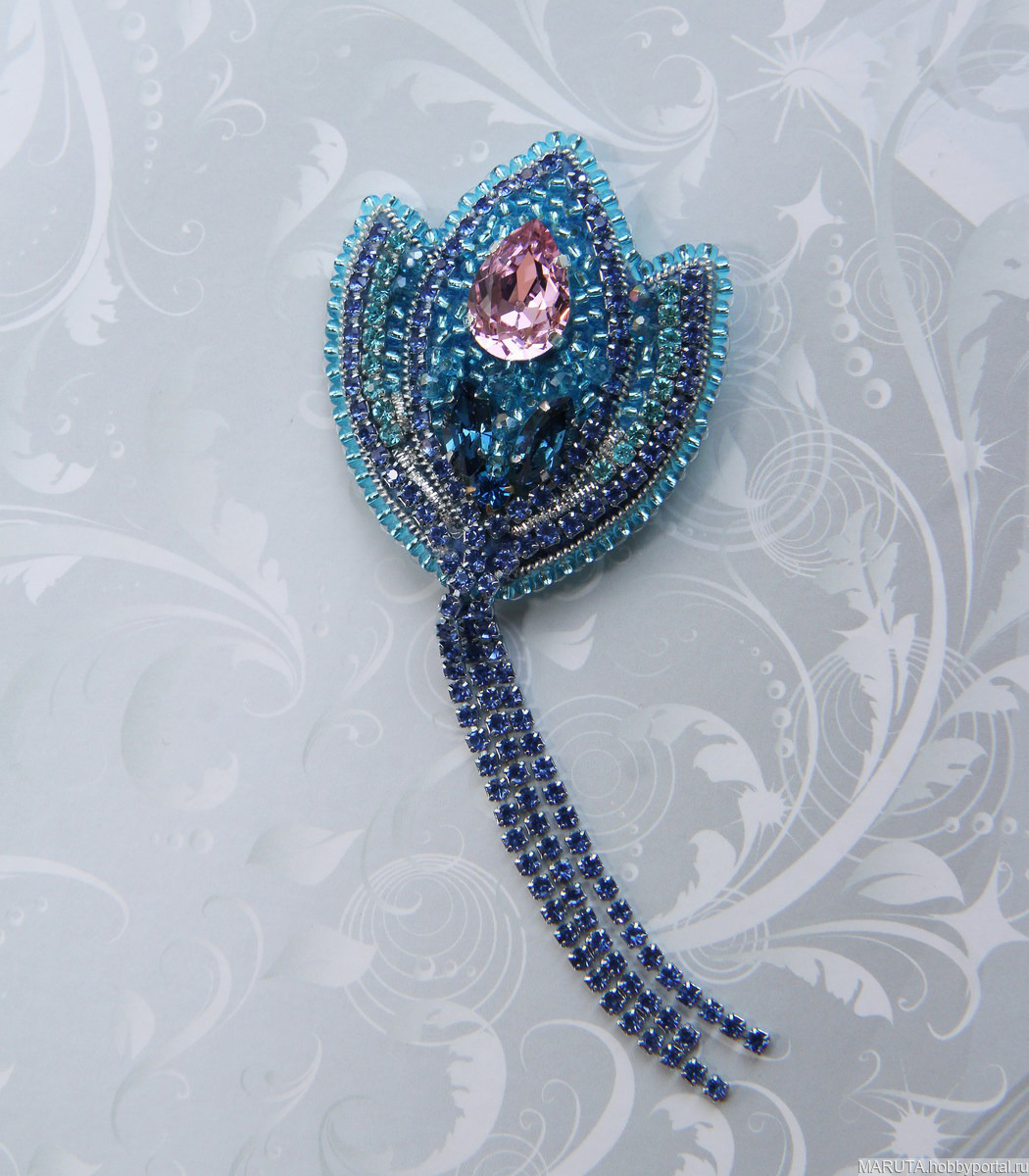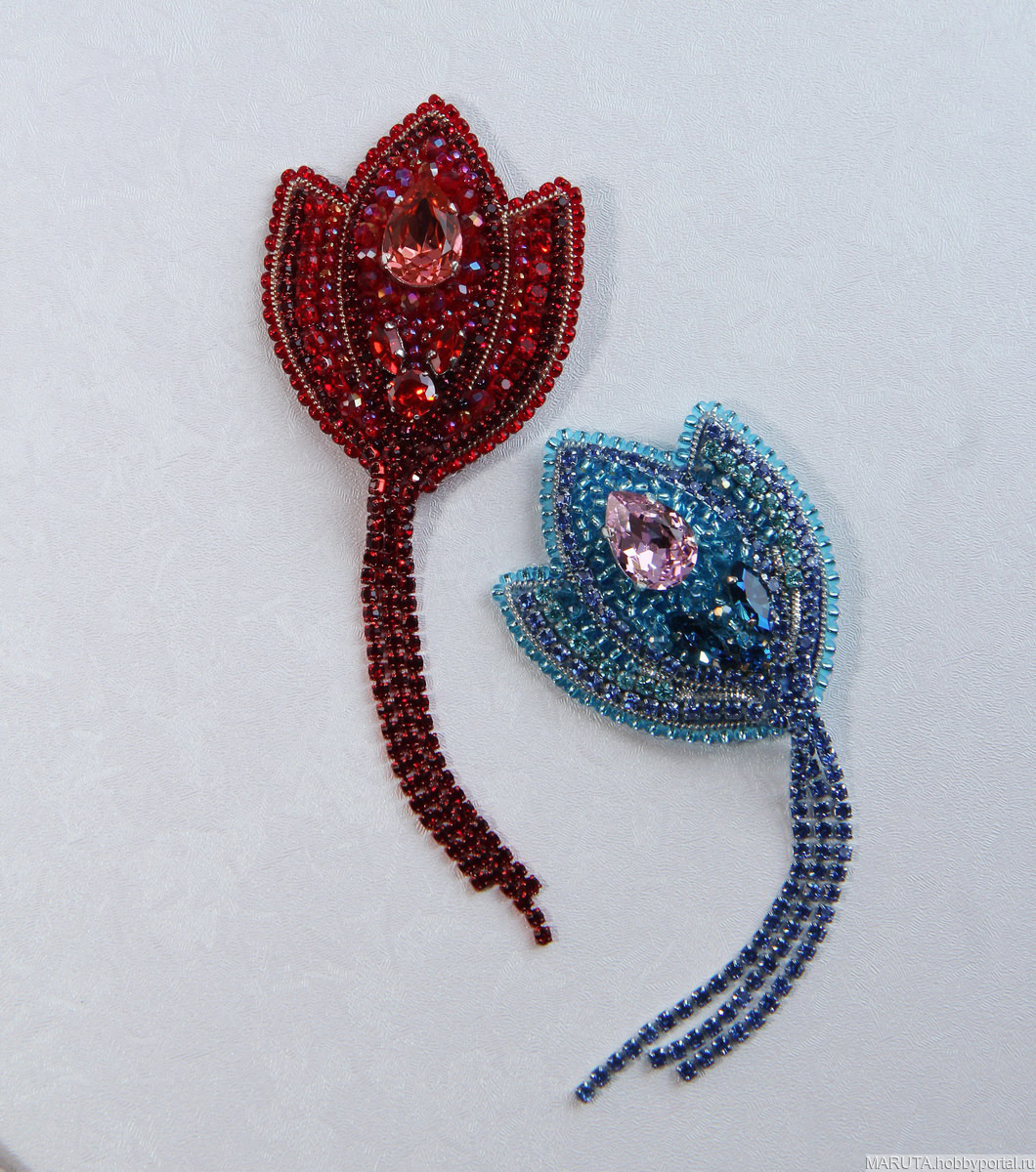 Брошь-тюльпан из кристаллов, бисера и стразовой