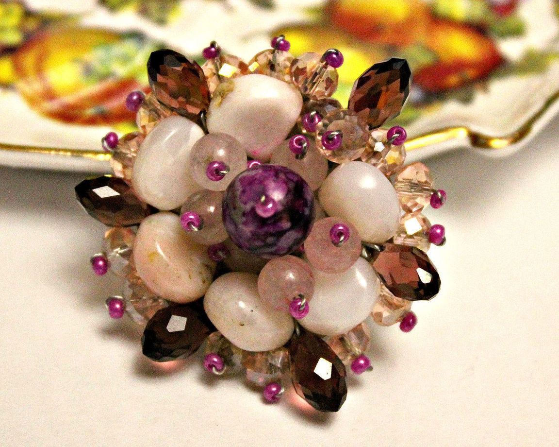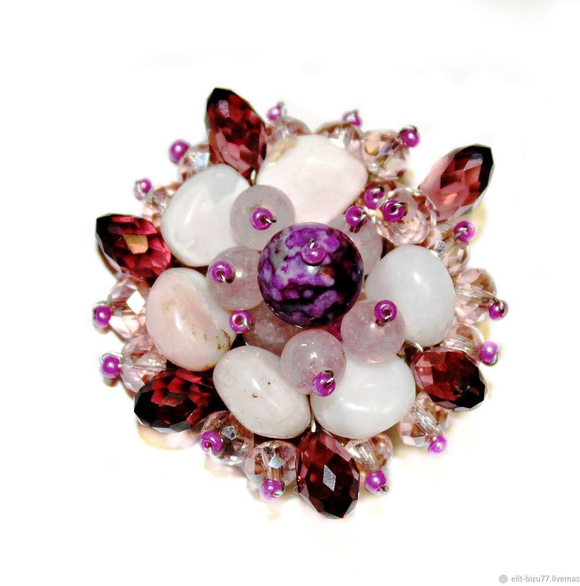 Нарядная брошь из натуральных камней - розового перуанского опала, розового кварца и хрусталя, нежная и элегантная, как светлая утренняя звездочка.