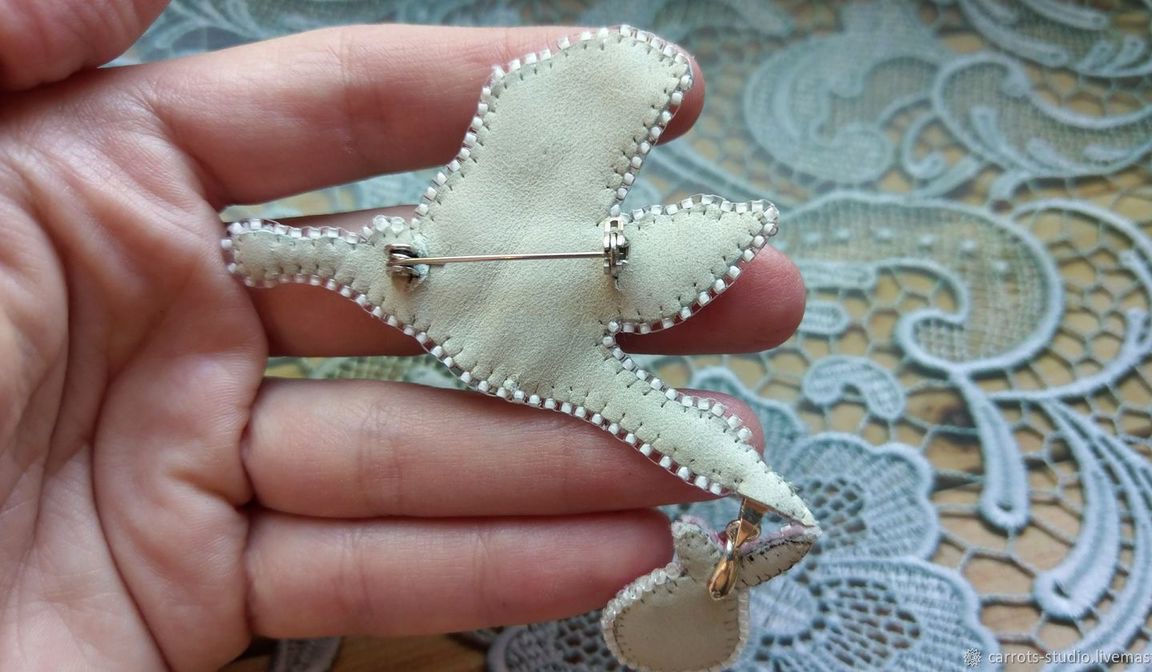 Брошь выполнена в технике художественная гладь. Вышивалась по итальянскому хлопку (поплин). Внутри броши, по нижней стороне имеется проволочный каркас, за счёт которого держится фурнитура с подвеской. Украшена ювелирным бисером (Япония). Изнанка закрыта натуральной кожей белого цвета. Застёжка с замочком. Брошь лёгкая. Хорошо дополняет романтический образ. Станет оригинальным подарком девушке в положении или аксессуаром для фотосессии.