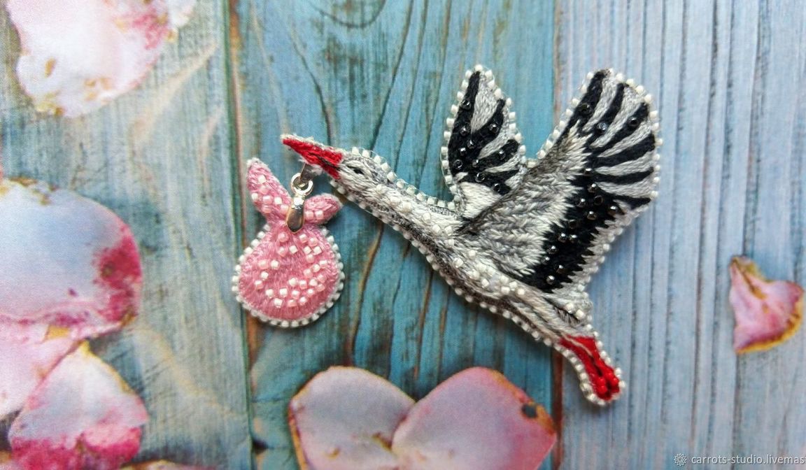 брошь, подарок беременной, вышивка гладью, аист с младенцем, беременность, в ожидании чуда, аксессуар для фотосессии, брошь на заказ, брошь аист, brooch, брошь птица, ждц девочку, brooch stork, stork, аистёнок, брошь гладью, художественная гладь