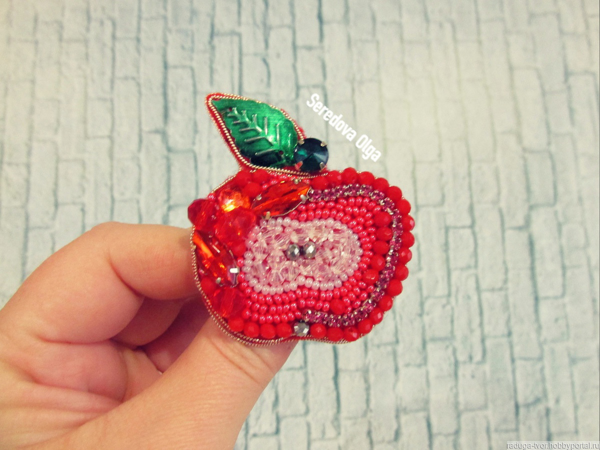 Моя новая брошь - "Яблочко". Вышита чешским бисером, бусинами, кристаллами, биконусами, с использованием стразовой цепочки. Брошь обшита канителью