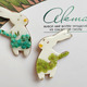 Брошь "Зайка-музыкант с зеленой гортензией" на деревянной основе в эпоксидной смоле.