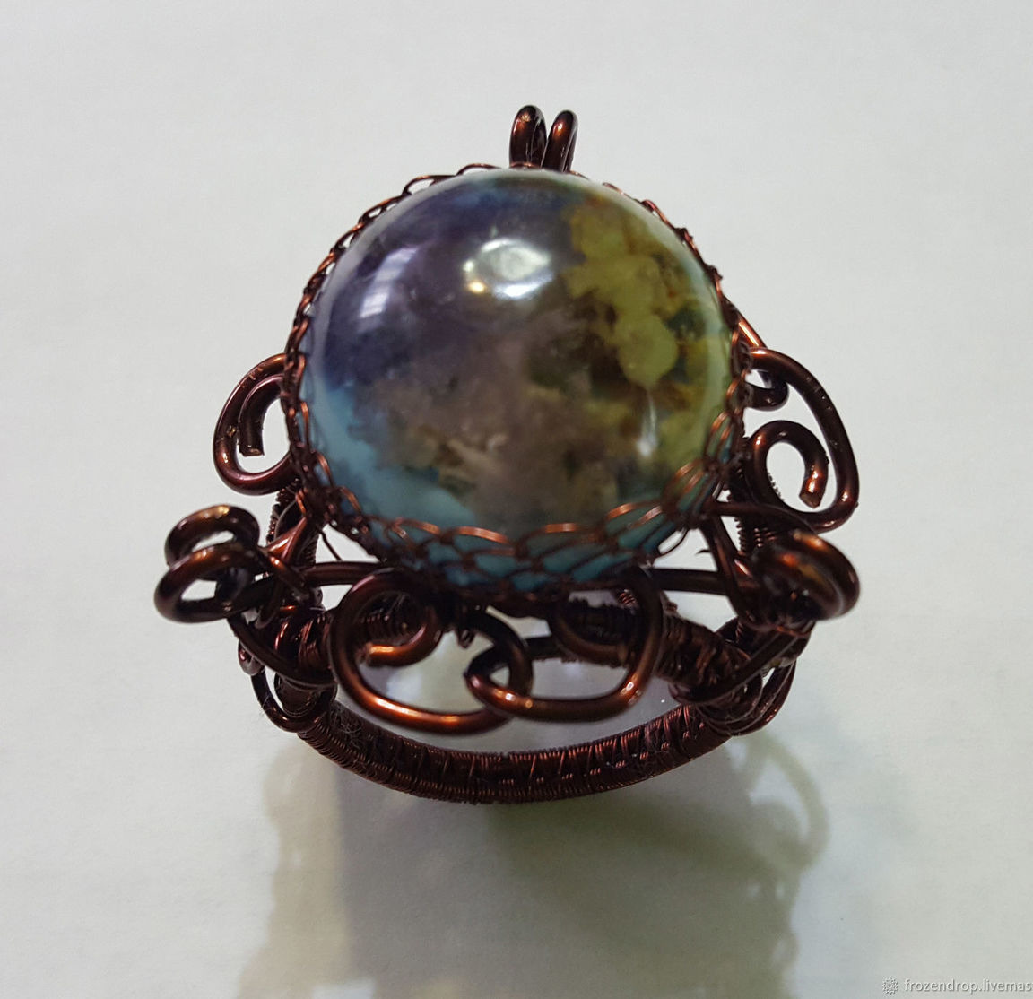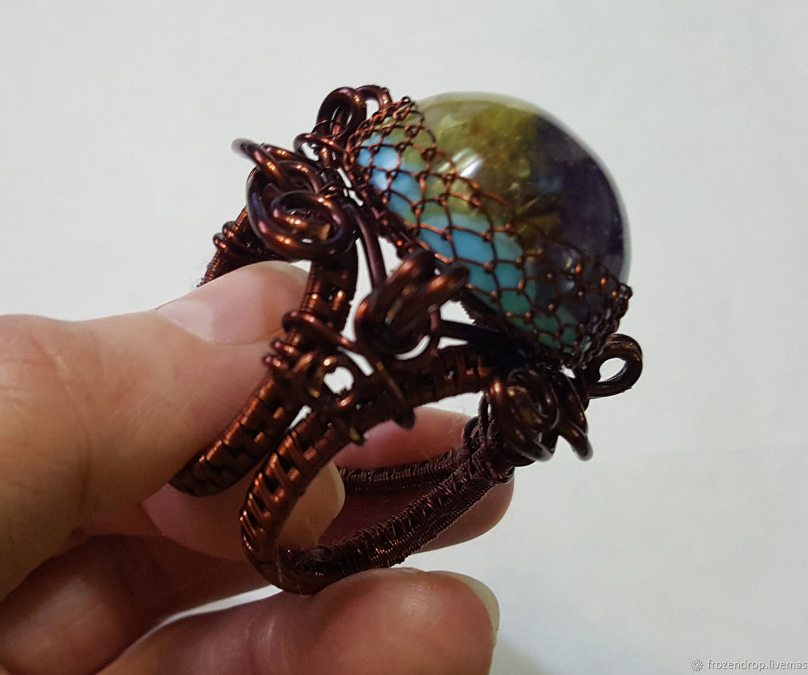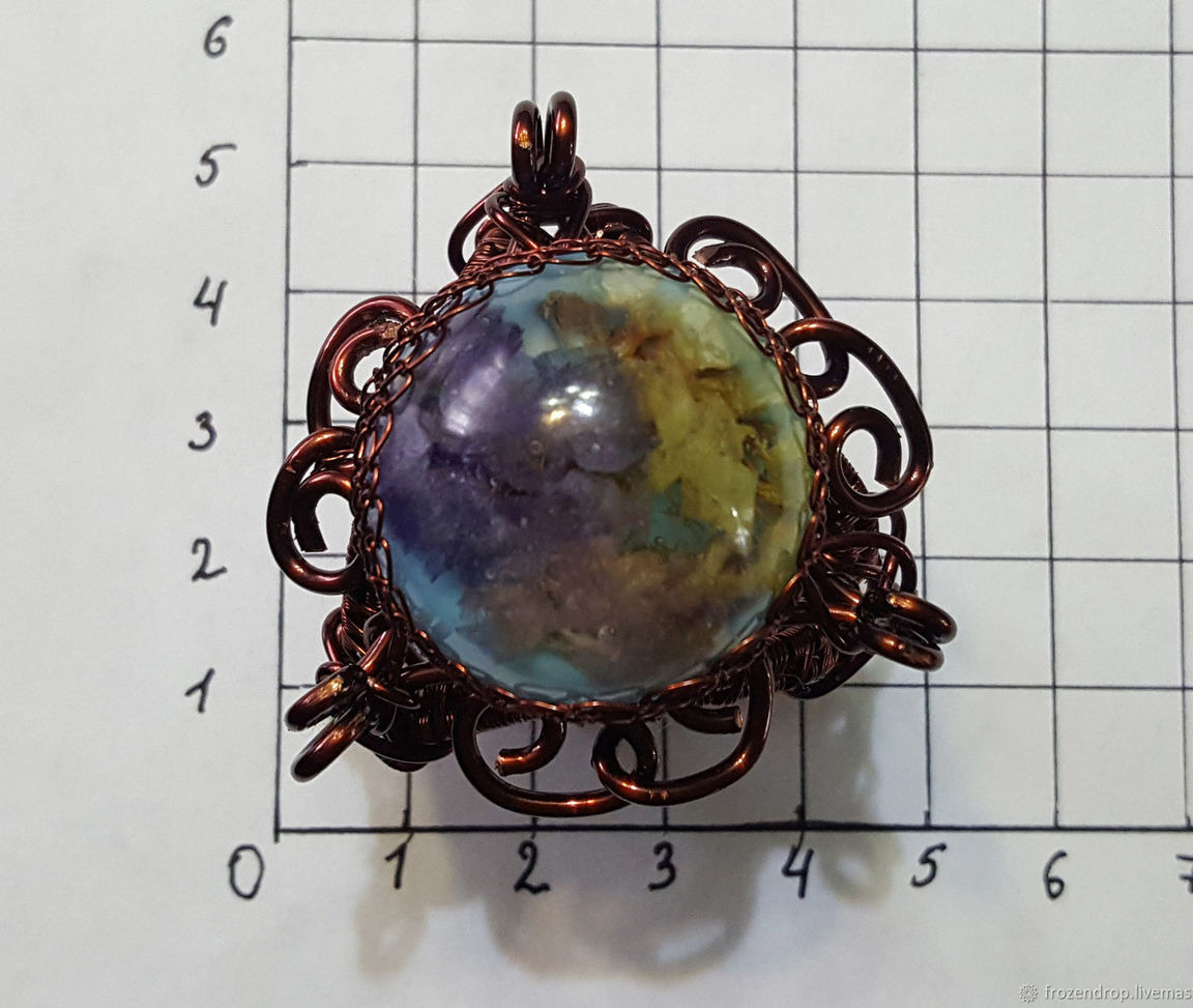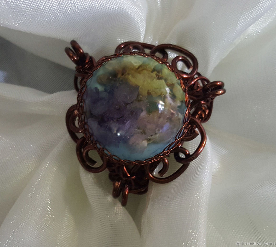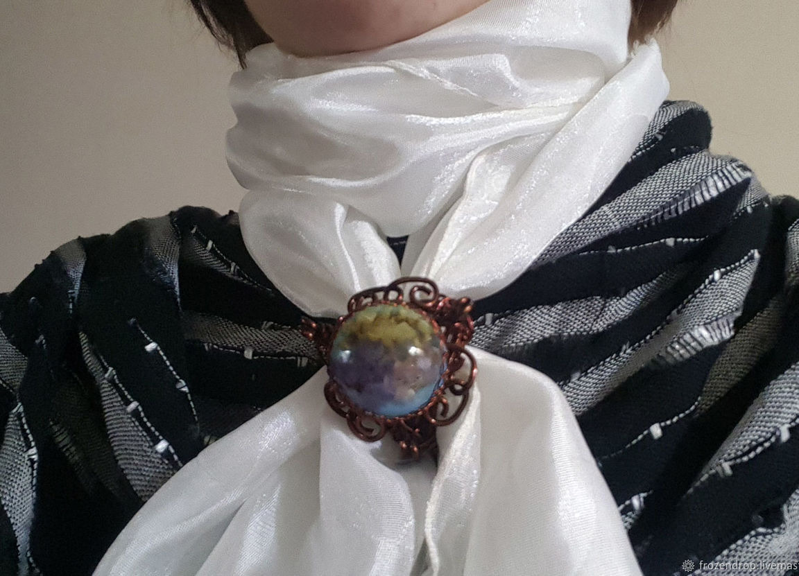 Брошь-зажим для платка (шарфа) в технике Wire wrap с вставкой из декоративного кабошона эпоксидной (ювелирной) смолы с живым цветком. Подходит для использования с платками средней плотности и объема.