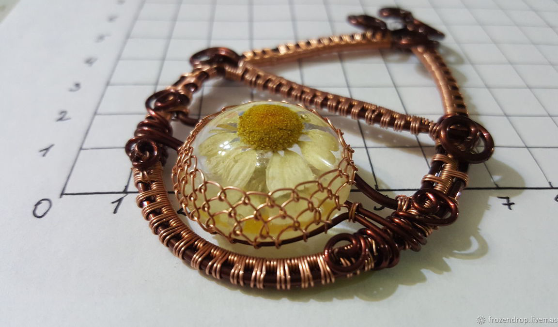 Брошь для платка (шарфа) в технике Wire wrap с вставкой из декоративного кабошона эпоксидной (ювелирной) смолы с живым цветком. Подходит для использования с платками малой и средней плотности и объема.