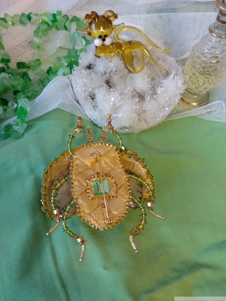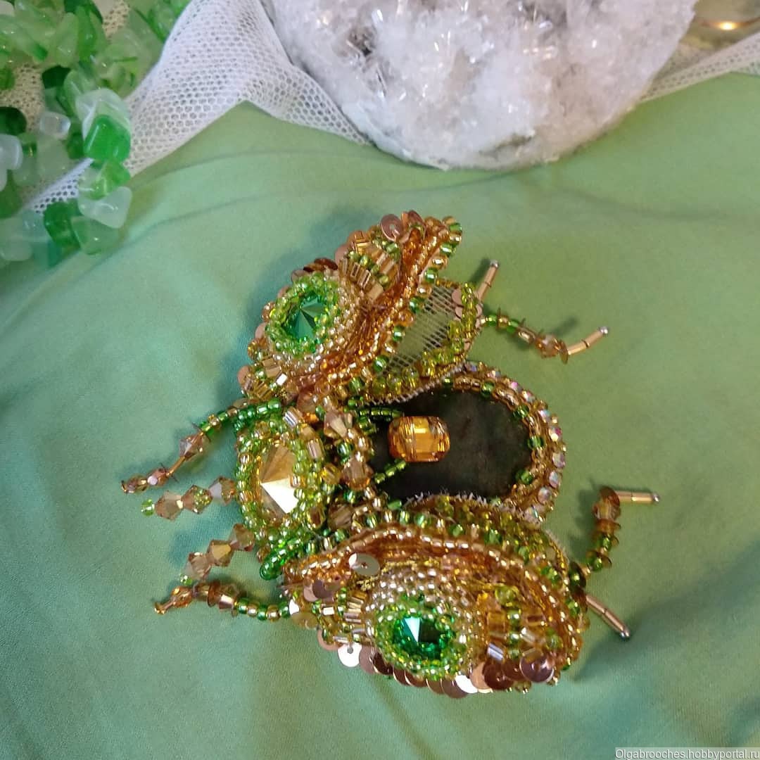 Брошь жук " Gold spring". Сверкает и сияет невероятно! Тельце выполнено из кабошона кианита, оплетенного японским бисером. На крыльях риволи сваровски цвета Scarabeus, оплетены японским бисером ToHo. Также крылья вышиты золотыми метализированными нитями и французскими пайетками. Подкрылышки вышиты также французскими пайетками. На спинке подвеска Сваровски. Голова выполнена из риволи Сваровски цвета metalic shine. Усики - биконусы Сваровски и над головой в виде короны также биконусы Сваровски! На лапках множество бусин: японский стеклярус, биконус сваровски и чешский бисер. С изнанки позолоченная застежка (Корея). Обшита изнанка кожзамом.