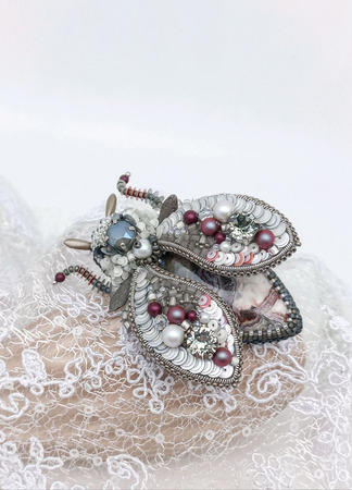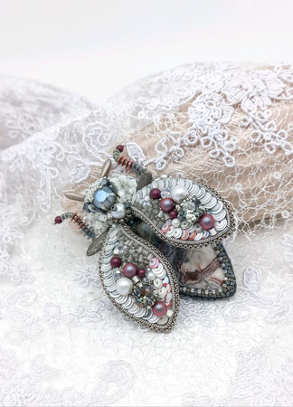 Немного блеска добавляют к творению природы небольшие кристаллы Сваровски. Изысканный жемчуг этого же бренда, японский бисер, итальянские и французские пайетки, винтажный бисер, канитель, хрустальные бусины.