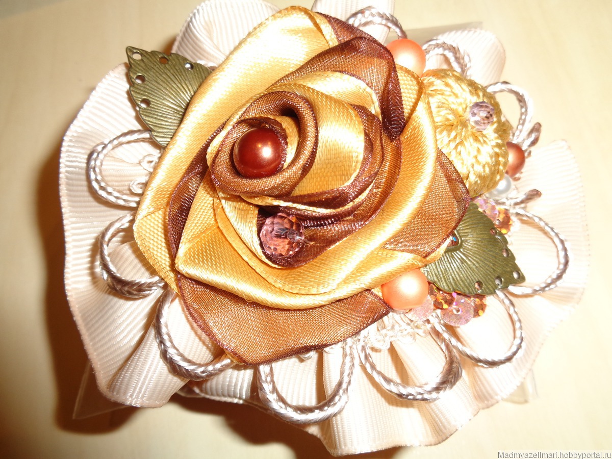 Брошка "Осень" выполнена в смешанной технике с использованием атласных лент, жемчуга и кристаллов "Сваровски", вязанного элемента, коннектора в виде золотого листика, шелковой тесьмы.Размер брошки 12 х 9 см. Застежка - декоративная булавка.