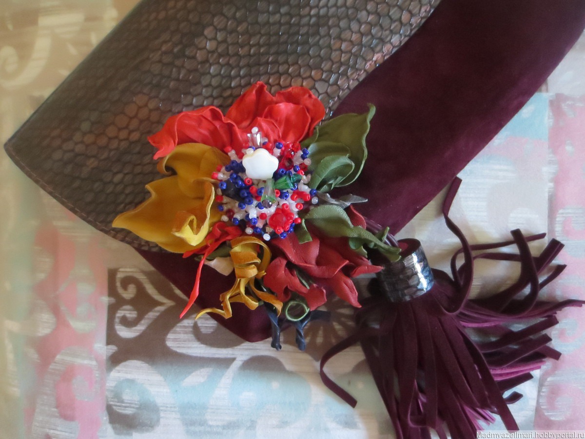 Брошка из натуральной итальянской кожи, чешского бисера "Прециозо", натурального жемчуга - выполнена в смешанной технике. Брошка имеет застежку - декоративная булавка. Может использоваться как украшение в повседневной жизни и как прекрасный элемент праздничной одежды.