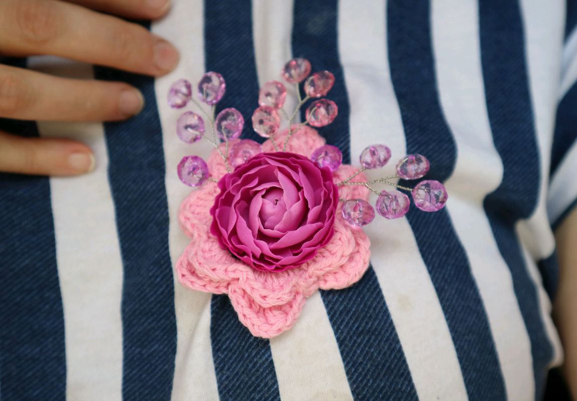 *Брошка ручной работы выполнена из хлопковой пряжи, полимерной глины, акриловых бусин, проволоки и металлической основы.