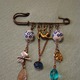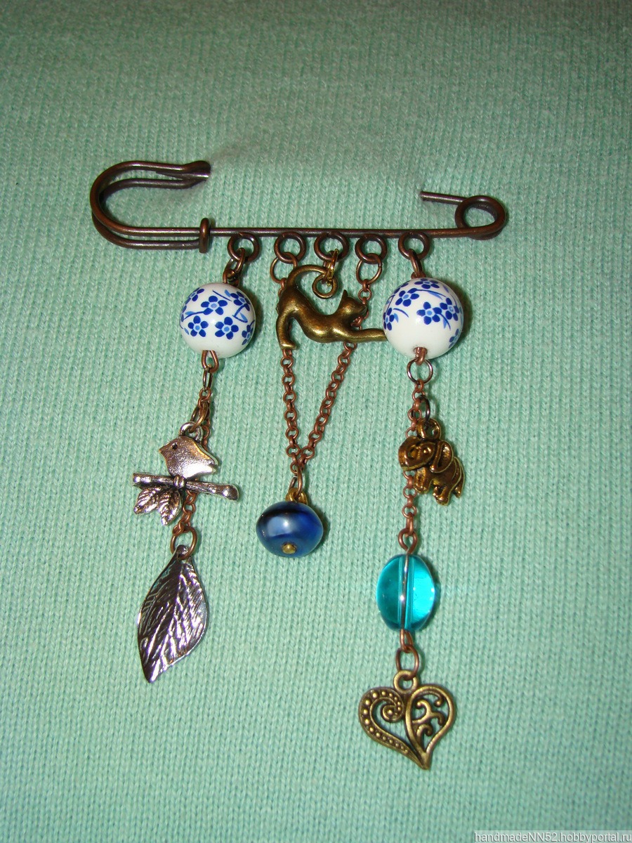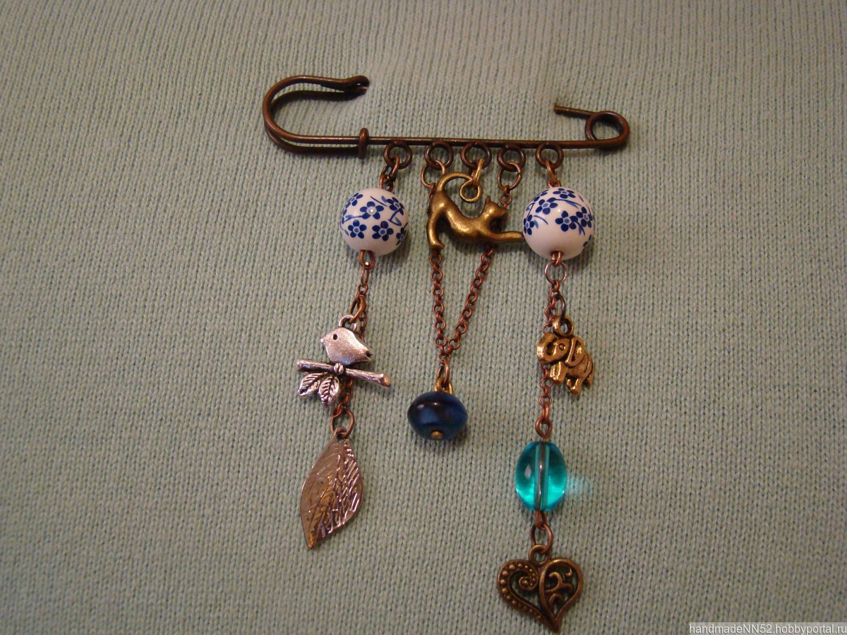 цепь медная; керамические бусины; стеклянные бусины; подвески медные - кошка и сердце, подвески под серебро - птичка и лист, подвеска под золото - слон.