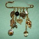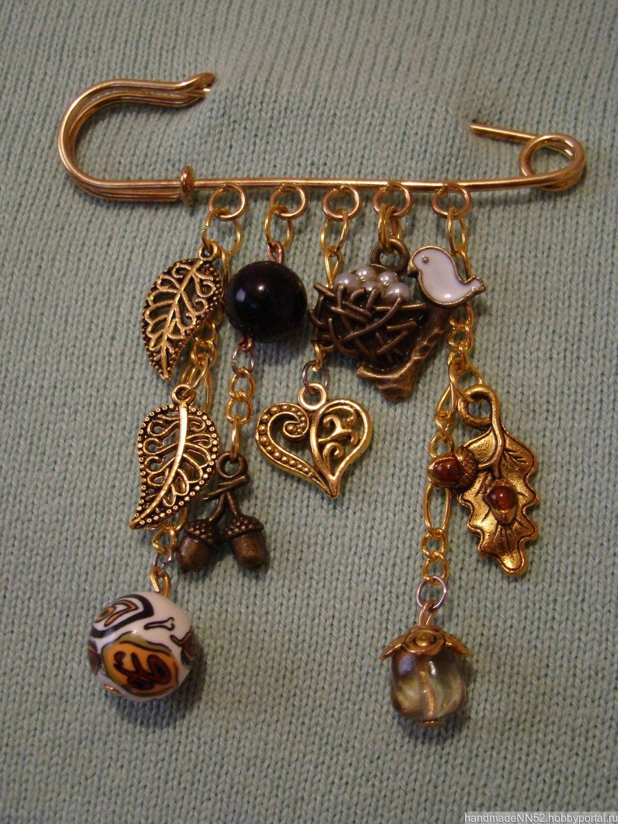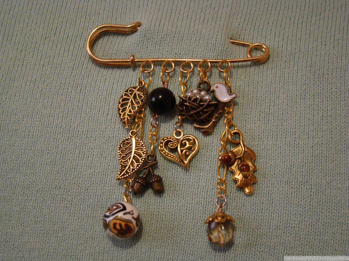 цепь золотая; керамические бусины; стеклянные бусины; подвески под золото - листочки, сердце,листочек с желудями, подвески под медь - желуди, подвеска бронзовая - птичка в гнезде.