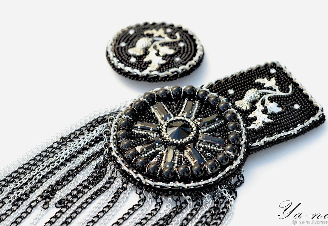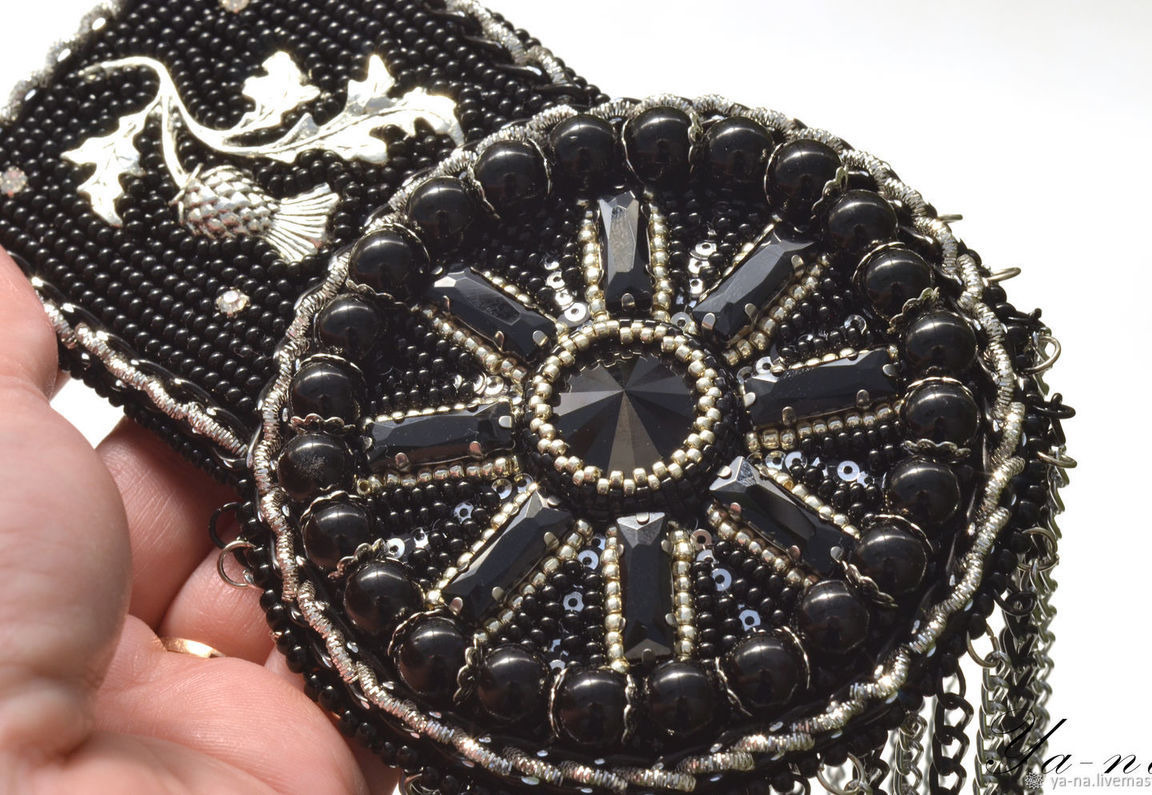 Эполет объемный, в центре стоит кристалл от Сваровски в оправе из черно-серебристого бисера. По кругу вышит бусинами агата.
