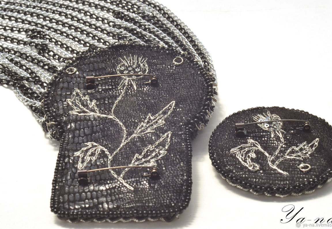 натуральная кожа, Японский бисер, бусины из камня, цепи, агат черный, риволи сваровски (swarovski), стразы, пайетки