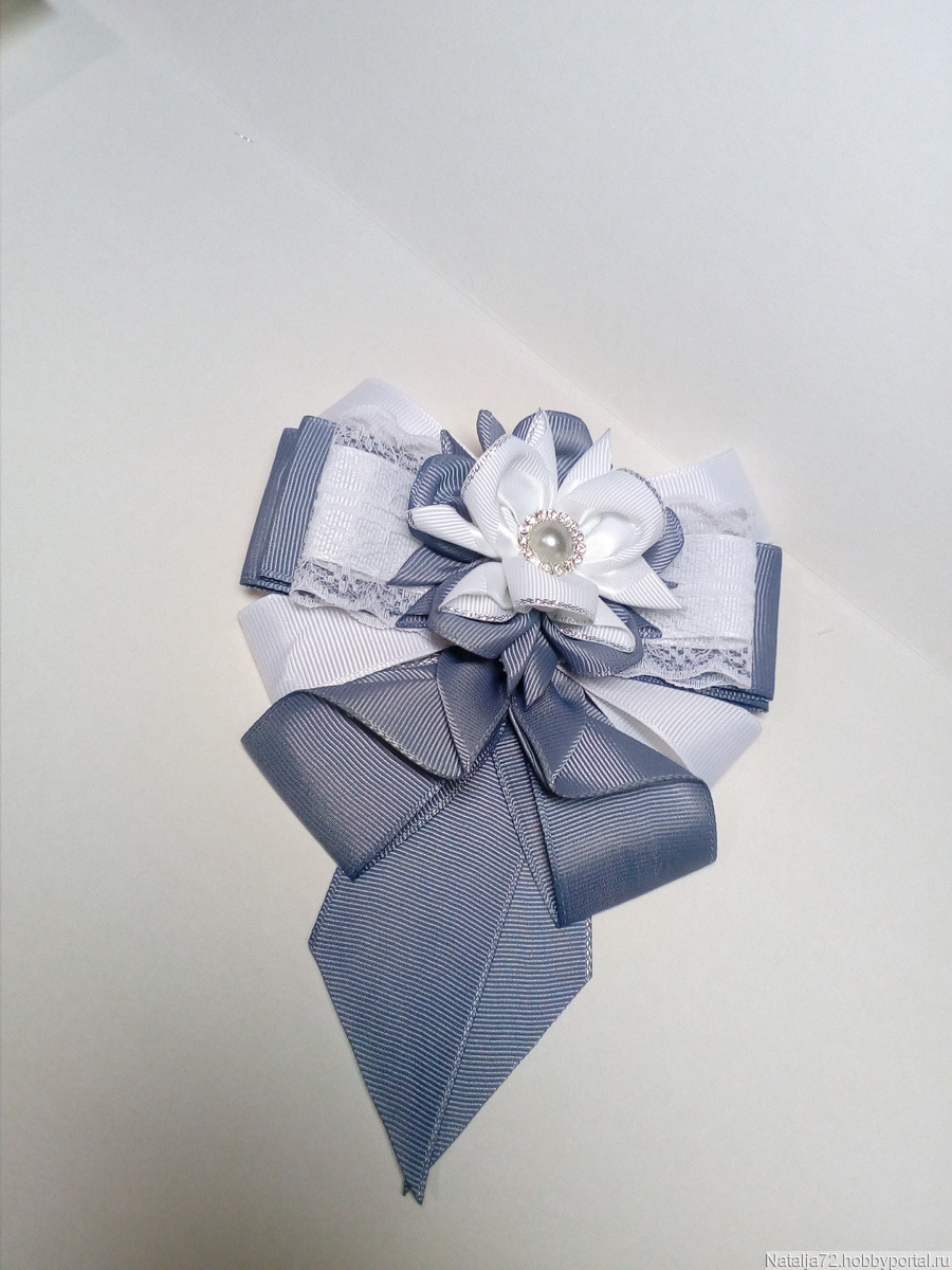 Галстук-брошь для школьницы выполнен из репсовой ленты с добавлением кружева. На обратной стороне изделие снабжено застежкой-булавкой с зажимом.